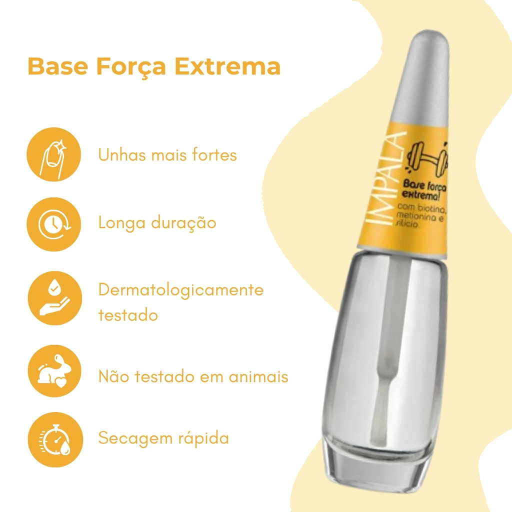 Unhas mais fortes, bonitas e protegidas desde a primeira aplicação! O Kit Esmalte Impala Base Força Extrema foi desenvolvido para quem sofre com unhas frágeis, quebradiças e precisa de um cuidado intenso e eficaz. Se você quer fortalecer suas unhas sem abrir mão da beleza e praticidade, esse kit é a escolha certa! Um aliado perfeito para manter suas unhas saudáveis no dia a dia. Sobre o produto: - Marca: Impala. - Linha: Cuidados especiais. - Conteúdo: 7,5 ml. - Hipoalergênico. - Vegano. - Com Ativos de Silício, Metionina e Biotina. - Com Pantenol e Vitamina E. - Não testado em animais. - Dermatologicamente testado. O que faz: - Fortalece as unhas, tornando-as mais resistentes a quebras e rachaduras. - Trata e protege unhas frágeis. - Melhora a estrutura das unhas. Indicado para: - Unhas fracas, quebradiças ou danificadas. - Quem busca unhas mais saudáveis. - Profissionais de manicure e pedicure. - Cuidados pessoais em Casa. Modo de uso: - Agite bem antes de usar. - Aplique a Base sobre as unhas. - Comece pelo centro e, em seguida, preencha as laterais. - Se desejar realize a esmaltação. - Aguarde a secagem. Precauções de uso: - Não expor ao calor/luz solar, não ingerir. - Manter fora do alcance das crianças. - Usar somente em adultos, não usar sobre a pele irritada ou lesionada. - Em caso de irritação, suspender o uso e procurar orientação médica. Com secagem rápida, brilho suave e tratamento eficiente, o Kit Impala Base Força Extrema é seu novo essencial de cuidados com as unhas. Não perca tempo: dê às suas unhas o cuidado que elas merecem e conquiste força extrema com um toque de beleza! Surgiu alguma dúvida? Entre em contato com a gente! Boas Compras :)
