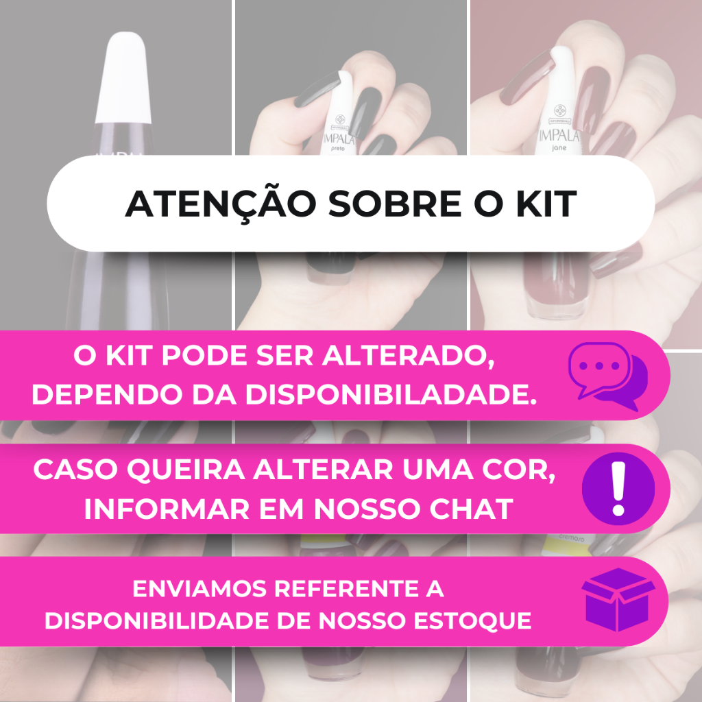 🌈 Kit Esmalte Impala - 5 Cores: A Cor da Sua Moda e Tendência! A linha Impala A Cor da Sua Moda foi criada para acompanhar você em todas as ocasiões, com uma seleção de 5 tonalidades que vão do clássico ao fashion, sempre alinhadas às tendências nacionais e internacionais. É a escolha perfeita para quem busca qualidade profissional e estilo. 💖 Por que a Impala é a sua melhor escolha: ✔️ Alta cobertura: Cor uniforme já na primeira aplicação. ✔️ Longa duração: Unhas impecáveis por mais tempo. ✔️ Brilho intenso: Finalização perfeita e profissional. ✔️ Secagem rápida: Agilidade para o seu dia a dia. ✔️ Fórmula segura: Dermatologicamente testada e não testada em animais. 🎨 O kit completo conta com 5 cores incríveis: ✔️ Preto ✔️ Café Café ✔️ Jane ✔️ Donata ✔️ Audrey 💅 Ideal para quem busca versatilidade e estilo! Destaque suas unhas com o estilo e a qualidade que só a Impala oferece. ⚠️ Atenção: o produto possui variação. Antes de finalizar a compra, verifique e selecione corretamente a opção desejada para garantir que receba as cores exatas que procura. 📦 Características: Kit com 5 Esmaltes Impala, Alta Cobertura, Longa Duração e Brilho. 🌸 Qualquer dúvida, estamos à disposição!