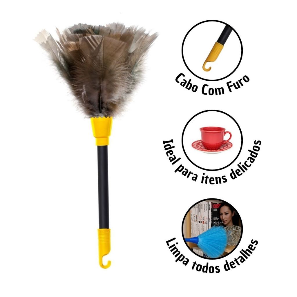 Olá, seja bem vindo a Mega Store. Todos nossos produtos são novos e estão disponíveis a pronta entrega, além de serem despachados em até 24 horas úteis. KIT 5 ESPANADORES Os espanadores Shangrila removem o pó e são indicados para limpeza em geral. São ótimos para na limpeza simples de móveis, carros, computadores, até locais de difícil acesso como prateleiras de lojas, vitrines, limpeza de cristais, e lustres. Vem com o kit: - 05 Espanadores Color 20 Especificações: Modelo: Color N°20 Pena: Peru Tamanho da Pena = 16 cm Tamanho do Cabo = 18 cm Tamanho Total = 34 cm As penas podem ter variação de tamanho por se tratar de um produto natural. Cabo pode haver variação de cores.