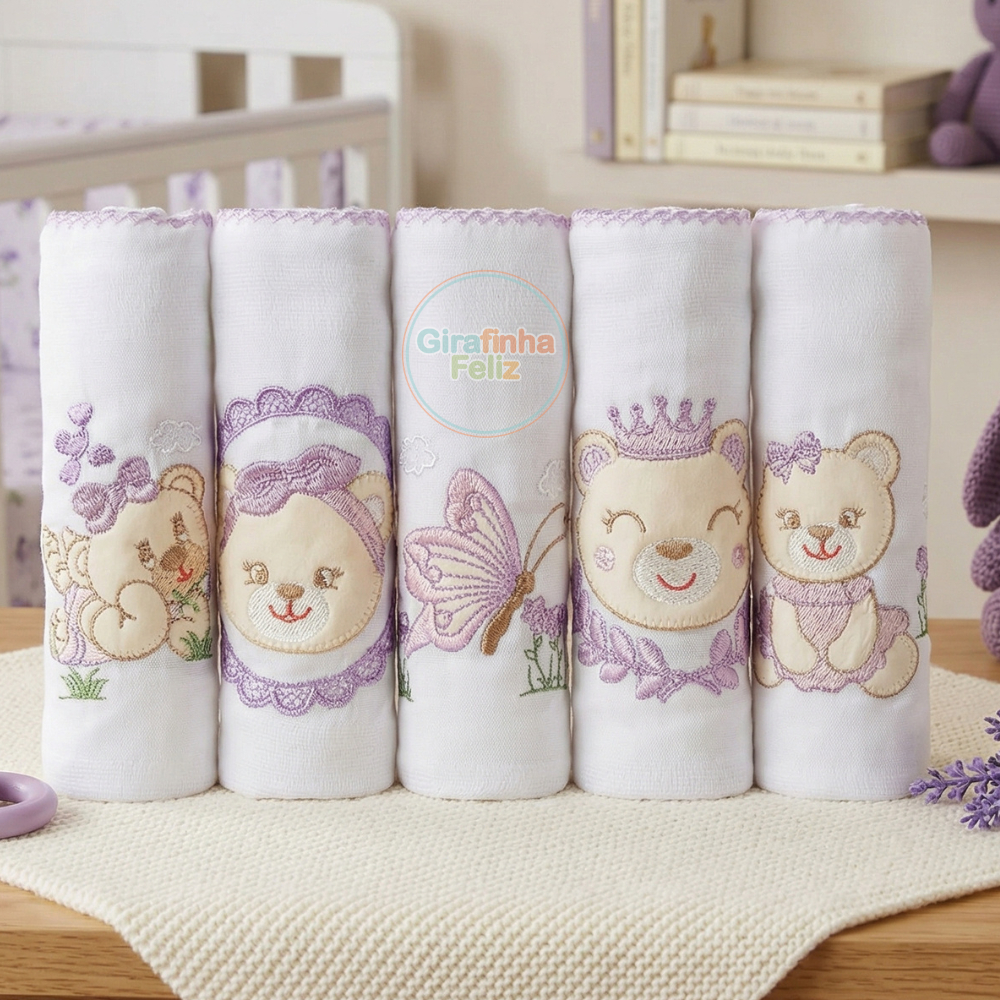 Kit 5 Fraldas de Pano Luxo Para Bebê Bordadas 70x70cm Tecido Duplo 100% Algodão Enxoval Menino Menina