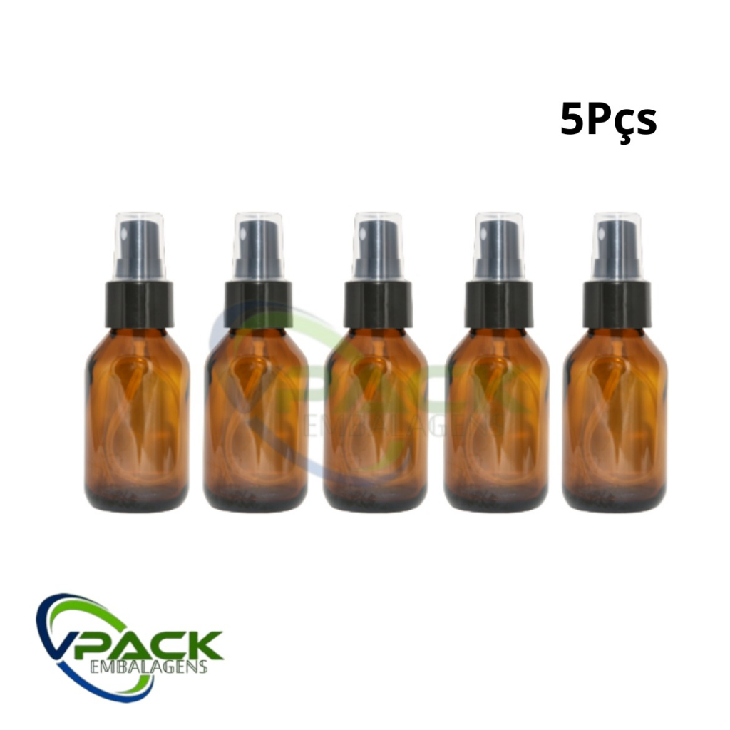 kit 5 Frascos De Vidro Âmbar 60ML Com Válvula Spray Preta ou Branca