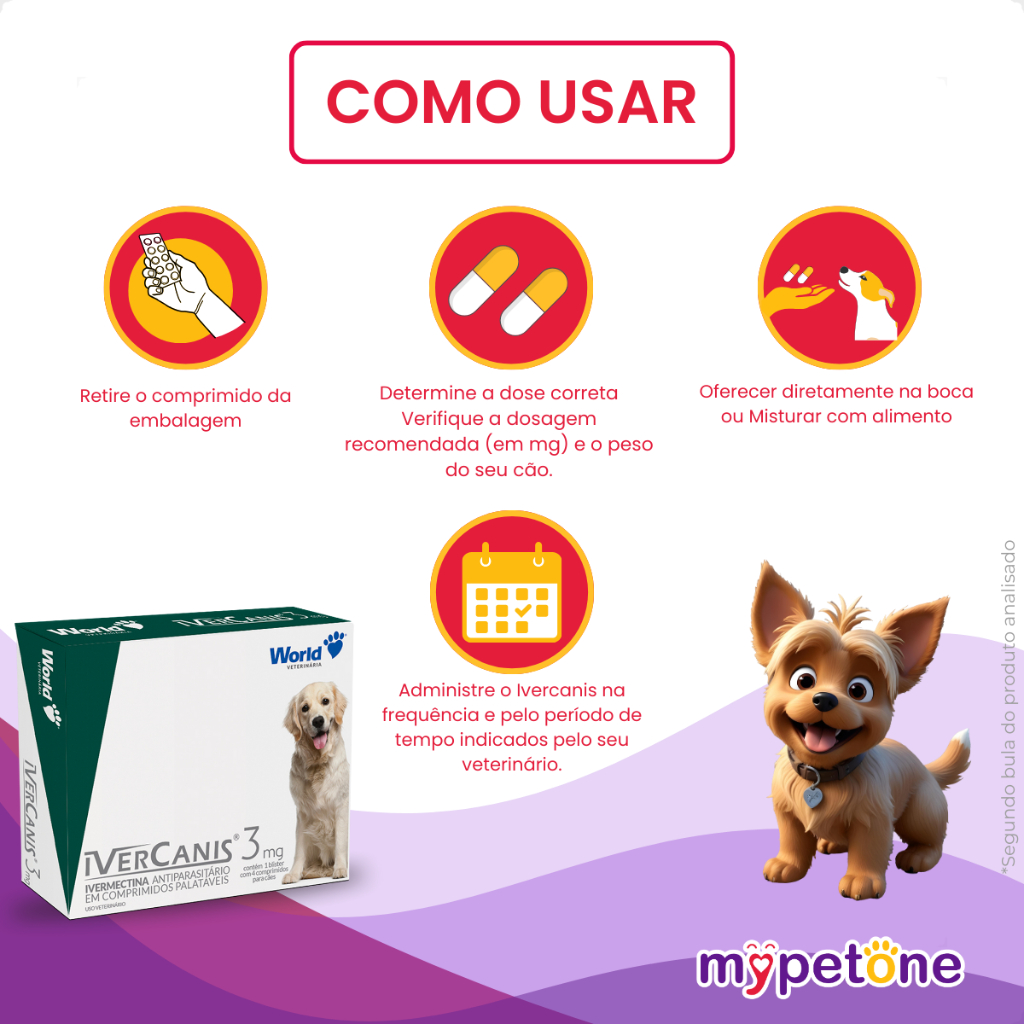 IverCanis 3mg para Cães de 15Kg - Blíster 4 Comprimidos - Comprimidos palatáveis; - Antiparasitário à base de ivermectina; - Indicado no tratamento da sarna sarcóptica. * Consulte sempre o Médico Veterinário de sua confiança para o uso apropriado deste produto. Leia a bula ou informações descritas na embalagem. Detalhes O IverCanis 3mg para Cães de 15Kg - Blíster 4 Comprimidos é um potente sarnicida, cujo princípio ativo é a ivermectina, endectocida do grupo das lactonas macrocíclicas. A ação da ivermectina contra os parasitas se relaciona à inibição da motilidade do parasito. Sabe – se hoje que essa molécula se liga seletivamente com alta afinidade aos canais de íon cloreto ligados ao glutamato nos nervos e nas células musculares dos invertebrados. Esses canais podem ocorrer bem próximos aos locais ligados ao GABA (ácido γ-aminobutírico). A ivermectina, assim como outras lactonas macrocíclicas, pode potencializar a atividade do GABA nos pontos de ligação em doses maiores. Nos artópodes, o local primário de ação é a junção mioneural, sendo o influxo de íon cloreto fator de diminuição da resistência da membrana celular com consequência a hiperpolarização do potencial de repouso das células pós-sinápticas. O resultado é uma paralisia flácida do parasito, que perde fixação e morre. IverCanis tem como componente ativo a ivermectina, um agente ectoparasiticida indicado para o tratamento de Sarna Sarcóptica causada por Sarcoptes scabiei (var. canis). Dicas Especiais O Antiparasitário World Veterinária IverCanis 3 mg para Cães de 15 Kg deve ser administrado via oral. Conservar em local seco ao abrigo da luz solar. Importante: Não é recomendado o uso em filhotes com menos de 6 semanas de vida, nem em fêmeas durante a gestação ou lactação. Não administrar o produto em cães da raça Collie, Pastor de Shetland, Border Collie, Old English Sheepdog, Australian Sheepherd (Pastor Australiano) e nos cruzamentos destas raças. Recomenda-se o acompanhamento minucioso das raças Galgo Afegão, Saluki, Whippet, Greyhound e Samoyed submetidos á terapia devido a apresentação de sensibilidade à ivermectina. Seguir sempre a orientação do Médico Veterinário. Posologia: Administrar, por via oral, 0,2mg/kg/dia, de acordo com o peso corporal, em dose única. Sendo: 1 comprimido de IverCanis 3mg para ................................................................................................. 15 kg Os comprimidos poderão ser partidos em seu(s) sulco(s) para ajuste de dosagem. Em caso de infestações severas, em estágio de evolução adiantado, para controlar ninfas resultantes da eclosão dos ovos não atingidos pelo tratamento inicial, a dose poderá ser repetida uma ou duas vezes, com intervalos de 7 dias, a critério do Médico Veterinário. Indicação: Cachorros Porte/Raça: Raças Pequenas Idade: Adultos Composição: Cada comprimido de 3mg contém: Ivermectina .............................. 3mg Excipiente q.s.p. ....................... 180mg Apresentação: 1 Blister com 4 Comprimidos