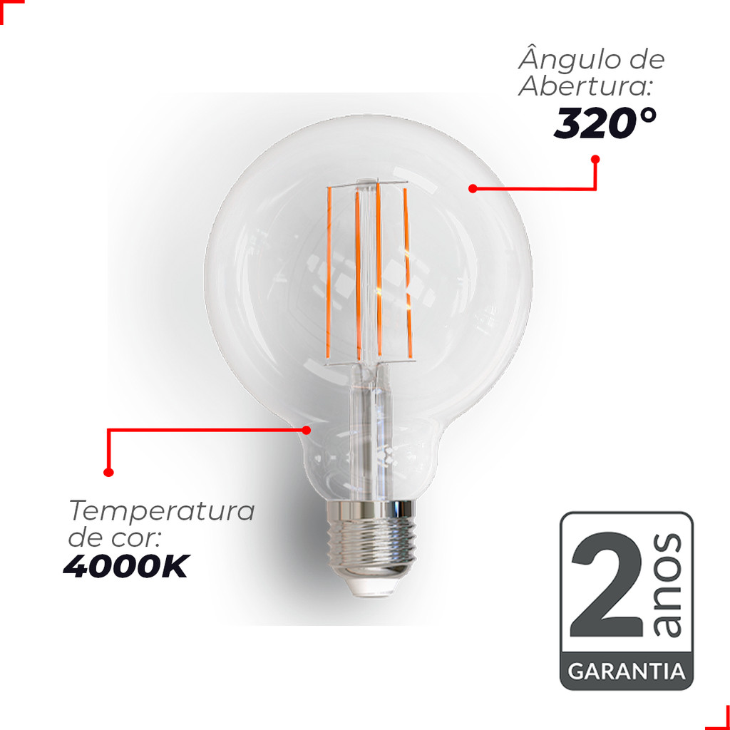Kit 5 Lampada Led Globo Retro Clear G95 9W 4000k E27 Deluxe