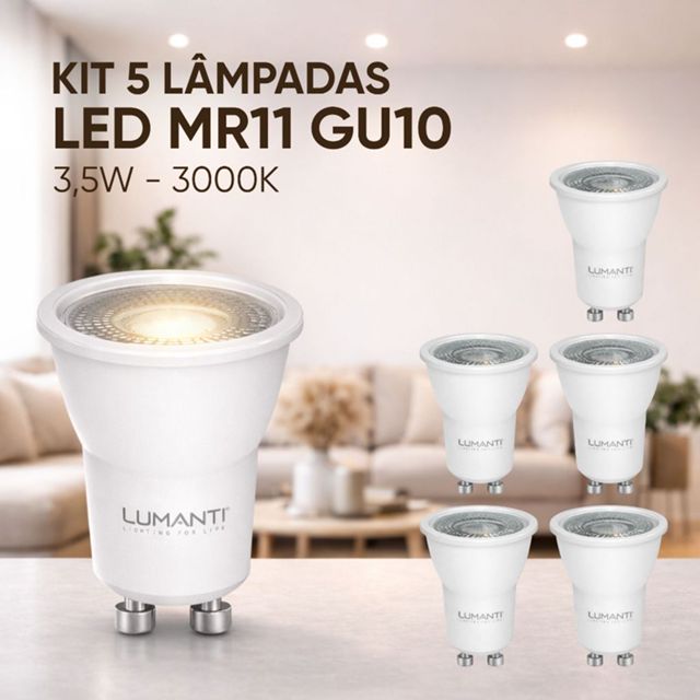 Kit 5 Lâmpadas LED MR11 GU10 3,5W 3000K Luz Quente Spot Bivolt Lumanti Iluminação Decorativa
