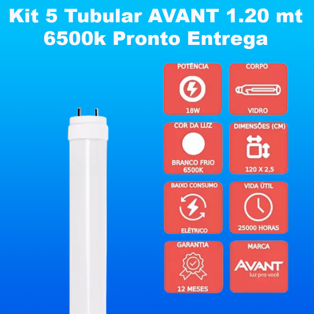 Kit 5 Lâmpadas LED Tubular T8 18W 120cm 6500K Bivolt – Avant