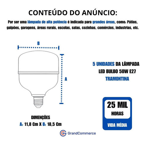 TRAMONTINA! SINÔNIMO DE QUALIDADE E CONFIANÇA! Possuir uma boa iluminação nos espaços em que estamos influencia a maneira como nos sentimos, relaxamos, trabalhamos ou estudamos. É por isso que a lâmpada da Tramontina Lâmpada Led Bulbo, 50W, Tramontina, Pack 5, Branco frio 6500k, Alta potência, Super branca, para grandes áreas, galpões, áreas rurais, pátios, escolas, salas, comércios, industrias, etc pode ser uma excelente opção se você quiser criar um ambiente agradável e funcional.