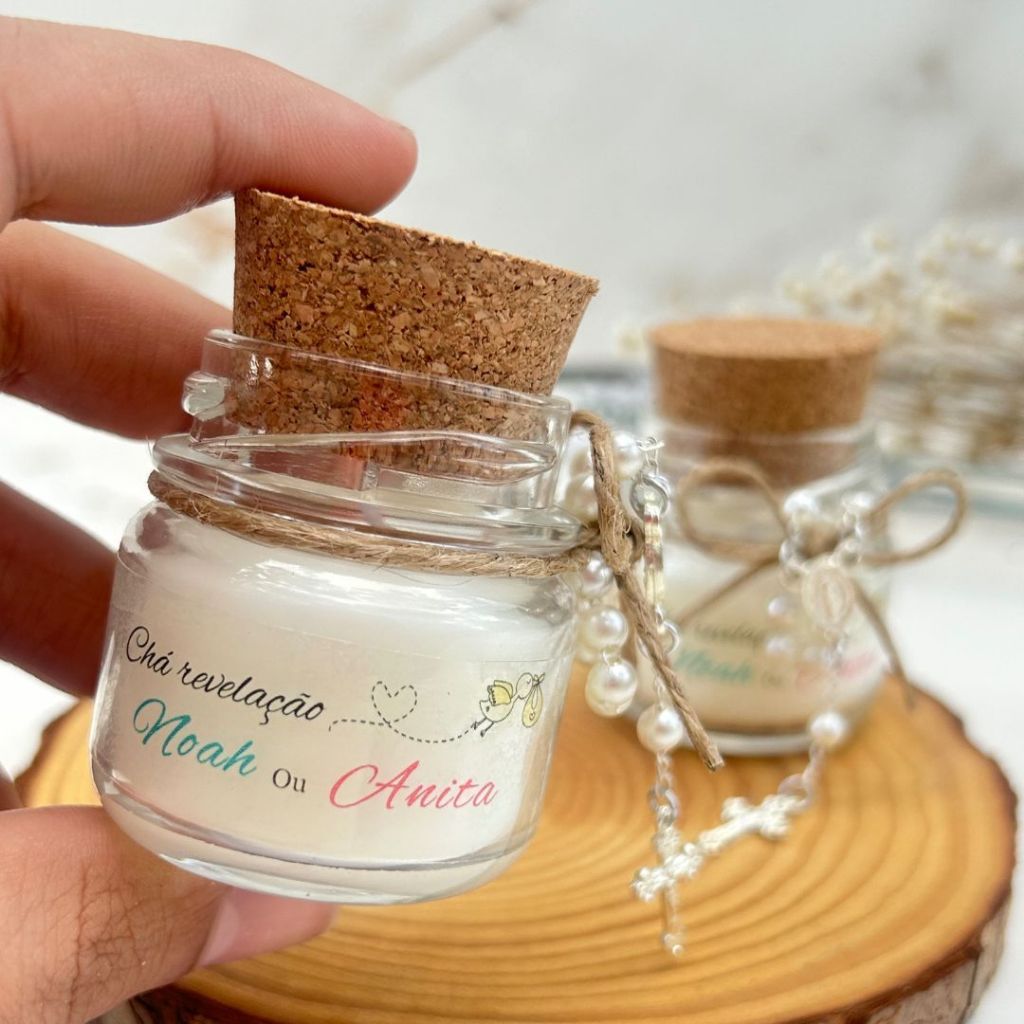 KIT 5 VELAS PERSONALIZADAS PARA MATERNIDADE, BATIZADO, CASAMENTO, ANIVERSÁRIO Transforme suas celebrações em momentos inesquecíveis com nosso Kit de 5 Velas Personalizadas. Ideal para maternidade, batizado, casamento ou aniversário, cada vela é uma experiência única e especial! Características das Velas As velas são confeccionadas com cera vegetal de alta qualidade, garantindo uma queima limpa e prolongada. Com essência de alta concentração, você pode escolher o aroma que mais combina com seu evento, entre as opções como Baby, Flor de Laranjeira, Limão Siciliano, Lavanda, Bambu e Alecrim. Cada vela vem embalada em um elegante frasco de vidro com tampa de rolha de cortiça, adornado com um delicado laço de rami e um mini terço branco. Um toque especial que encanta a todos! Dimensões: - Altura: 6 cm - Diâmetro: 4,5 cm - Peso: aproximadamente 80g Personalização Você pode personalizar as etiquetas como desejar! Basta entrar em contato conosco após a compra. Lembre-se: caso não envie as informações de personalização em até 24 horas, seu pedido será enviado sem personalização. Prazo de Produção e Envio Por se tratar de um produto personalizado, nosso prazo de postagem é de 3 dias úteis. Após a compra, envie os dados para a personalização e aguarde nossa confirmação. Como e Quando Receber Seu Pedido Nossas velas são enviadas para todo o Brasil via shopee xpress. O prazo de entrega será informado ao adicionar o produto ao carrinho. Faça seu pedido agora e encante seus convidados com nossas velas personalizadas cheias de amor e carinho!