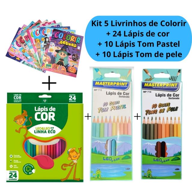 Kit 5 Livrinhos de Colorir Revistinha + 24 Lápis de Cor + 10 Lápis Tom de Pele + 10 Lápis Tom Pastel