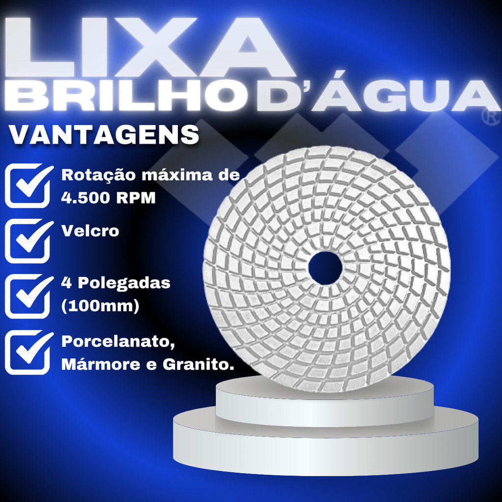 Kit 5 Lixa Diamantada Polir Granito Suporte Rebolo Adaptador O Kit 5 Lixa Diamantada Polir Granito Suporte Rebolo Adaptador é utilizado para acabamento, desbaste e ajuste no corte de 45 graus em porcelanato, mármore e granito. Rende até 2x mais que os produtos similares vendidos no mercado. Fabricado com matéria prima nobre, o que proporciona alta durabilidade e resistência à fricção e temperatura. Pode ser utilizado em qualquer tipo de pedra natural e artificial, com tecnologia que não mancha a pedra, proporcionando um brilho excelente sem utilização de ceras. O Kit 5 Lixa Diamantada Polir Granito Suporte Rebolo Adaptador deve ser utilizado em máquinas elétricas e pneumáticas (lixadeiras e politrizes) com eixo M14 e regulagem de velocidade, acoplado ao suporte velcrado para discos de 100mm (4 polegadas). Importante: - Rotação máxima de 4.500 RPM; - Verifique o sentido do giro do disco e o acoplamento das flanges de fixação do eixo; - Sempre utilize EPI´s durante a operação; - A vida útil dos produtos depende da rotação da máquina e da dureza da pedra a ser desbastada. Quanto mais dura a pedra, maior o desgaste dos produtos. O Kit 5 Lixa Diamantada Polir Granito Suporte Rebolo Adaptador contém: - 5 Lixas brilho d'água (grão 50, 100, 200, 400, 800, 1500, 3000); - 1 Rebolo cônico grão 120; - 1 Adaptador M14; - 1 Prato com velcro 4 polegadas. Características técnicas do Kit 5 Lixa Diamantada Polir Granito Suporte Rebolo Adaptador: Lixa de alto brilho d’água 4 polegadas: - Velcro; - Dimensão: 4 polegadas (100mm); - Rotação máxima de 4.500 RPM. Prato velcrado 4 polegadas: - Velcro; - Eixo M14; Agradecemos a sua visita. Anker do Brasil IMAGENS MERAMENTE ILUSTRATIVAS