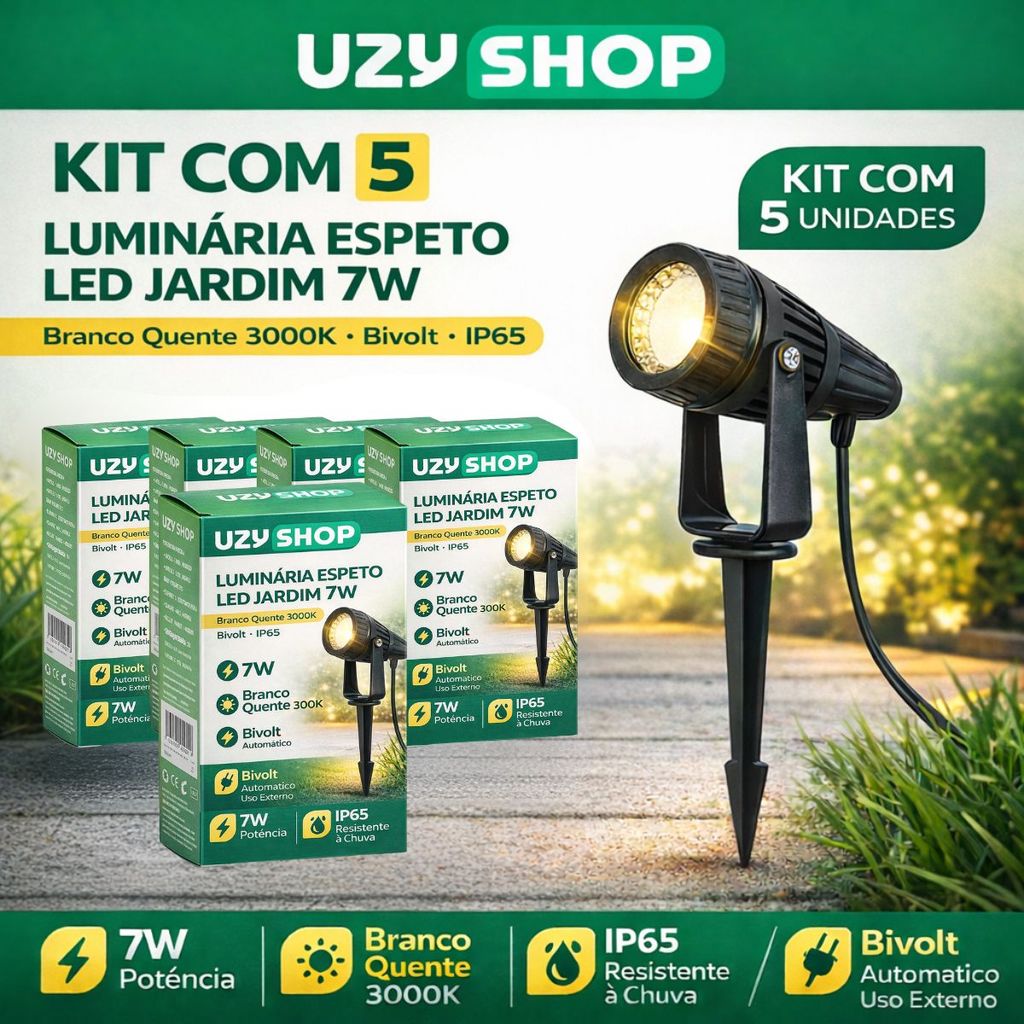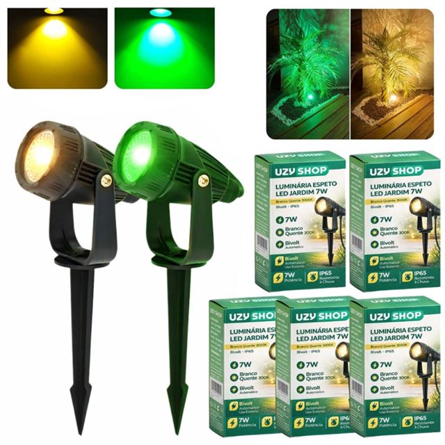 Ilumine seu jardim com eficiência e estilo usando o Kit com 10 Luminárias Espeto de Jardim LED 7W da UzyShop 🌿✨ Cada unidade emite luz branco quente (3000K), criando um ambiente aconchegante e elegante para áreas externas. Com proteção IP65, resiste à chuva e poeira, garantindo durabilidade em qualquer clima. Instalação prática tipo espeto, ideal para jardins, calçadas, fachadas e paisagismo. Tensão bivolt automática e eficiência energética classe A para economia na conta de luz. Envio rápido para todo Brasil 🚚 Garantia do vendedor: 30 dias 🛡️ Material resistente e alta durabilidade ✅ Principais características - Kit com 10 luminárias espeto LED 7W cada - Luz branco quente 3000K, aconchegante e decorativa ou Verde - Proteção IP65 (resistente à chuva e poeira) - Tensão bivolt automática (127V/220V) - Eficiência energética classe A - Instalação prática: espeto diretamente no solo - Material plástico resistente, cor preta Especificações técnicas - Potência: 7W por luminária - Temperatura de cor: 3000K (branco quente) ou Verde - Grau de proteção: IP65 - Tensão: bivolt automático - Cor da carcaça: preto - Dimensões: 18,5cm x 8cm x 5cm (cada) - Material do refletor: plástico Indicações de uso - Jardins residenciais e comerciais - Calçadas, entradas e fachadas - Áreas de paisagismo e decorativas - Canteiros, caminhos e escadas externas - Eventos e iluminação temporária Instalação e cuidados - Espete firmemente no solo, em local plano e estável - Conecte na tomada adequada (bivolt automático) - Para limpeza, desligue e use pano seco - Evite submersão ou jatos de água diretos Conteúdo da embalagem - 10 luminárias espeto LED 7W - Prontas para instalação Garantia - Garantia do vendedor: 30 dias contra defeitos de fabricação Dúvidas? Chame no chat 💬