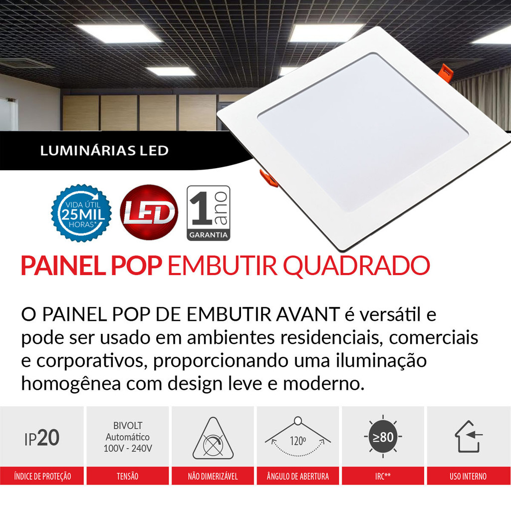 Painel Quadrado Embutir 30W Avant O PAINEL POP DE EMBUTIR AVANT é versátil e pode ser usado em ambientes residenciais, comerciais e corporativos, proporcionando uma iluminação homogênea com design leve e moderno. Vida útil aproximada de vinte cinco mil horas Garantia de um ano concedido pelo fabricante Fluxo luminoso constante em toda faixa de tensão. Baixo consumo de energia Informações Técnicas: Potência: 30W Tensão: 127v/220v (Bivolt Automático) Fluxo Luminoso: 1800 Lumens Eficiência Luminosa: 60 Lumens / Watts Temperatura de Cor: 6500K Emissão de Luz: Branco Frio Tipo de instalação: Embutir Temperatura ambiente: -5°C a 40°C Vida útil Aproximada: 25 Mil Horas Índice de Proteção: IP20 Material: Poliestireno Dimensões Aproximada: 395x395x29mm (podem variar 5% para mais ou menos de acordo com o próprio fabricante) Nicho de Corte: 370x370mm Garantia: 1 Ano ATENÇÃO: Na instalação do transformador eletrônico, certifique-se de que o mesmo não ficará em contato coma luminária, pois toda a base da luminária funciona com o dissipador de calor, o que pode causar danos e interferências no funcionamento do transformador.