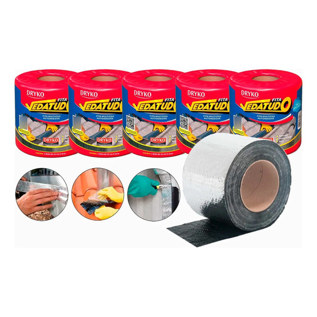 Composto por: - Manta Asfáltica Auto Adesiva Aluminizada 15cm X 10m - 05 Unidades Descrição: Indicada para vedação de cumeeiras, união de paredes com telhados, lajes e passagem de tubulações, reparos em calhas, rufos, dutos, telhas de fibrocimento, metálicas, cerâmicas e de fibra de vidro, além de trincas em concreto e alvenaria. A fita pode receber pintura desde que a tinta seja apropriada para aplicação em alumínio. Com estrutura impermeável que evita infiltrações e resiste aos raios solares. Reforça e protege a área aplicada. Aplicação rápida e fácil. Características: - Material da fita adesiva impermeável: Filme de alumínio e asfalto - Temperatura de trabalho da fita adesiva impermeável:- 5°C a 60°C - Temperatura de aplicação da fita adesiva impermeável:15°C a 50°C - Tamanho: 15cm X 10m Ficha Técnica: - Marca: Dryko - Aluminizada: Sim - Autoadesiva: Sim - Impermeável: Sim - Pode receber pintura: Sim (tinta apropriada para aplicação em alumínio) - Temperatura de aplicação: 15°C a 50°C - Temperatura de trabalho: - 5°C a 60°C - Material: Filme de alumínio e asfalto - Largura: 15 cm - Comprimento: 10 m - Tamanho: 15cm X 10m - Resistência ao destacamento: 80N/m - Cor Acabamento: Prata - Espessura: 0,45 a 0,65 mm - Dimensões da embalagem unitária: 15 x 12 x 12 cm - Peso unitário: 1.320kg