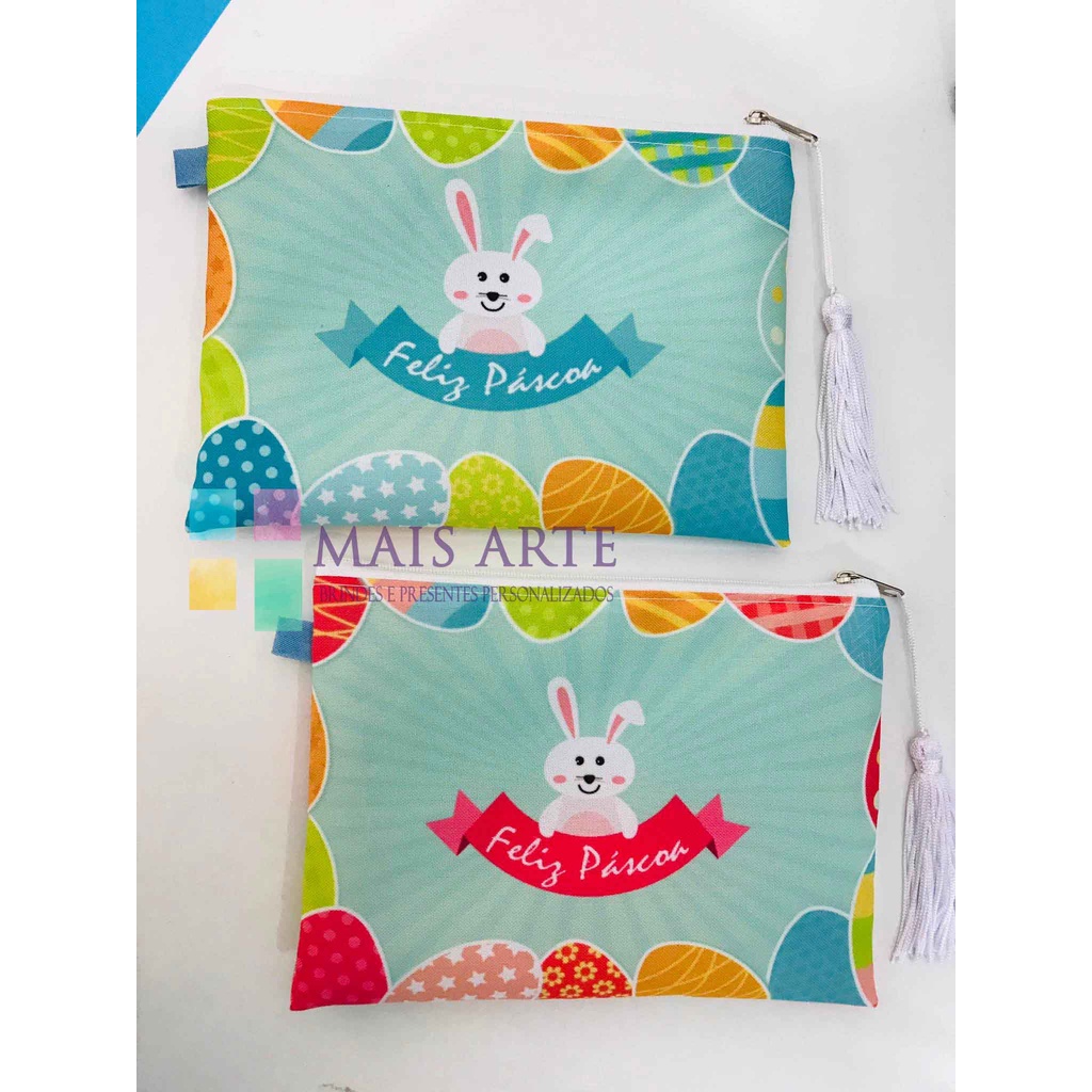 kit com 5 necessaires tema PÁSCOA! 1 de cada modelo igual a foto do anuncio (não é possível escolher o modelo) Estampa igual ao do anuncio. feita em poliester sem forro interno,(tecido de gramatura fina) , acompanha pingente. Tecido maleável . mede 14X18 cm não personalizamos.