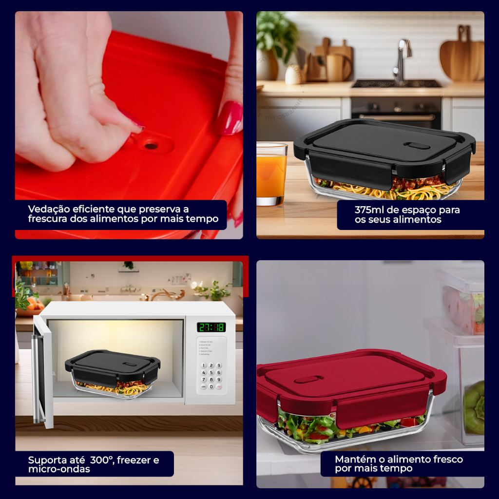 Potes de Vidro Herméticos Retangular: Praticidade e Segurança Armazene e transporte seus alimentos com segurança e estilo! Os Potes de Vidro Herméticos garantem vedação eficiente, resistência e versatilidade para o dia a dia. Destaques do Produto: Vidro Borossilicato: Resistente a variações de temperatura. Vedação Hermética: Tampa com travas que evitam vazamentos. Seguro e Atóxico: Livre de BPA, ideal para qualquer alimento. Fácil de Limpar: Compatível com lava-louças. Uso Versátil: Pode ir ao micro-ondas e forno (sem tampa). Design Funcional: Armazena melhor na geladeira e armários. Ideal Para: Levar refeições sem vazamentos. Armazenar alimentos no freezer ou geladeira. Transportar lanches e petiscos. Disponível em diferentes tamanhos e kits. Escolha o seu! Opções Disponíveis - Potes de Vidro Herméticos Tamanhos e Kits Disponíveis: 340ml – Kit com 5 ou 10 unidades Medidas: 4,5 cm (A) x 10,5 cm (L) x 14,5 cm (C) 370ml – Kit com 5 ou 10 unidades Medidas: 7 cm (A) x 11 cm (L) x 15 cm (C) 450ml – Kit com 5 ou 10 unidades Medidas: 5 cm (A) x 10 cm (L) x 15 cm (C) 550ml – Kit com 5 ou 10 unidades Medidas: 5,0cm (A) x 12,5 cm (L) x 17 cm (C) 640ml – Kit com 5 ou 10 unidades Medidas: 4,5 cm (A) x 12,5 cm (L) x 17 cm (C) 970ml – Kit com 5 ou 10 unidades Medidas: 6,0cm (A) x 14,8 cm (L) x 19,5 cm (C) 1040ml – Kit com 5 ou 10 unidades Medidas: 7 cm (A) x 15 cm (L) x 20 cm (C) 1500ml – Kit com 5 ou 10 unidades Medidas: 8 cm (A) x 18 cm (L) x 24 cm (C)