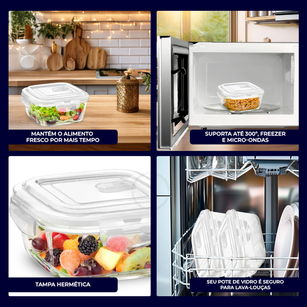 Potes de Vidro Hermético: Organização e Frescor para sua Cozinha! Este kit com 5 potes de vidro hermético é a solução perfeita para organizar sua cozinha e manter seus alimentos frescos por mais tempo. Com design elegante e funcional, ele combina praticidade e beleza. -Características: -Material: Vidro de alta qualidade, resistente e livre de BPA, garantindo a segurança alimentar. -Tampa hermética: A tampa possui 4 travas e uma válvula de silicone que garantem vedação perfeita, evitando vazamentos e mantendo a frescura dos alimentos. -Capacidade: Cada pote possui 310ml de capacidade, ideal para armazenar porções individuais ou pequenas quantidades de alimentos. -Versatilidade: Pode ser utilizado para armazenar diversos tipos de alimentos, como cereais, grãos, leguminosas, frutas secas, temperos e muito mais. -Empalhável: Os potes podem ser empilhados, otimizando o espaço na sua geladeira ou despensa. -Benefícios: -Organização: Mantém sua cozinha organizada e livre de bagunça. -Frescor: A vedação hermética preserva o sabor e a textura dos alimentos por mais tempo. -Higiene: O vidro é fácil de limpar e não absorve odores. -Versatilidade: Ideal para o dia a dia e para levar marmitas para o trabalho ou escola. -Durabilidade: O vidro é um material resistente e durável, garantindo longa vida útil aos potes. Tamanhos e Kits Disponíveis: 310ml – Kit com 5 ou 10 unidades Medidas: 5 cm (A) x 11 cm (L) x 11 cm (C)