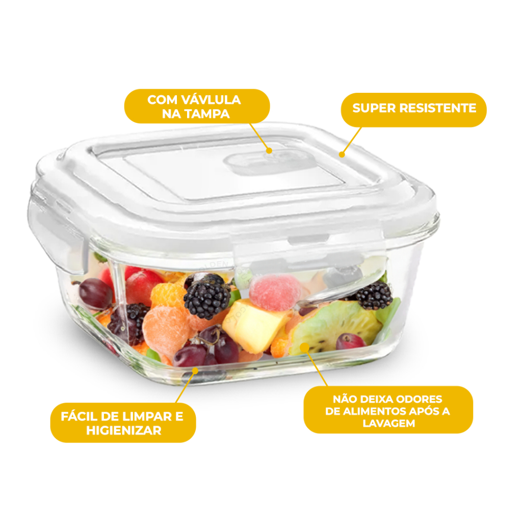 Potes Herméticos de Vidro Quadrados Praticidade, Segurança e Estilo no Armazenamento de Alimentos Diga adeus a marmitas que vazam e alimentos que perdem o sabor! Os Potes Herméticos de Vidro Quadrados oferecem a solução ideal para manter suas refeições frescas, seguras e com ótimo sabor por mais tempo. Destaques do Produto: Vidro Borossilicato: Resistentes a variações de temperatura, sem risco de trincar ou rachar. Vedação Hermética: Tampa com travas que garante um fechamento perfeito e sem vazamentos. Livre de BPA: Material atóxico, seguro para armazenar alimentos de todos os tipos. Fácil de Limpar: Pode ser lavado na lava-louças para maior praticidade. Uso Versátil: Compatível com micro-ondas e forno (sem a tampa), ideal para aquecer ou preparar suas refeições. Design Funcional: Formato quadrado que otimiza o espaço na geladeira e nos armários. Perfeito Para: Levar refeições para o trabalho ou faculdade. Armazenar alimentos na geladeira ou freezer. Transportar lanches e petiscos com segurança. Servir porções individuais com estilo e praticidade. Tamanhos e Kits Disponíveis: 310ml – Kit com 5 ou 10 unidades Medidas: 4,8 cm (A) x 11,2 cm (L) x 11,2 cm (C) 525ml – Kit com 5 ou 10 unidades Medidas: 5,5 cm (A) x 13,2 cm (L) x 13,2 cm (C) 700ml – Kit com 5 ou 10 unidades Medidas: 6,5 cm (A) x 15 cm (L) x 15 cm (C) 1000ml – Kit com 5 ou 10 unidades Medidas: 7 cm (A) x 17 cm (L) x 17 cm (C) Escolha o kit ideal e aproveite mais praticidade e estilo no seu dia a dia!