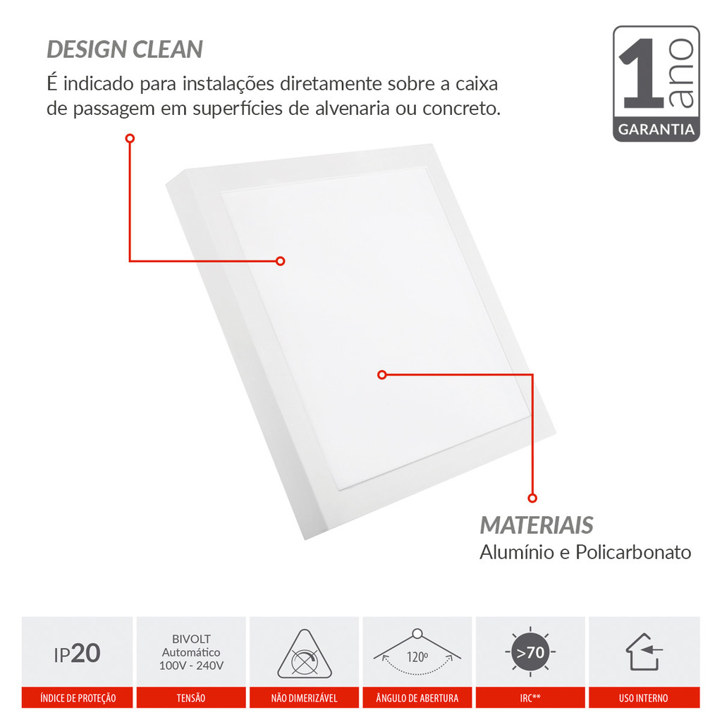 Kit 5 Painel Led Aluminio Quadrado 30w 3000k/4000k/6500k Branco Quente/Neutro/Frio 110v/220v Bivolt Branco Avant O Painel de Led Avant é ideal para instalações diretamente sobre a caixa de passagem, em superfícies de alvenaria ou concreto. Proporciona iluminação eficiente e moderna para diversos ambientes. Propriedades: Corpo em alumínio e difusor em policarbonato Potência: 30w Fluxo luminoso constante em toda faixa de tensão Possui transformador eletrônico isolado Medidas: 40x40 Nas opções de Temperatura de cor: 3000k Branco quente 4000k Branco Neutro 6500k Branco Frio IRC: >70 Ângulo de abertura: 120° Índice de proteção: IP20 (uso interno) Características de Funcionamento: Temperatura ambiente: -5°C a 40°C Tensão nominal: 100V a 240V (Bivolt automático) Fator de potência: >0,50 Baixo consumo de energia Não dimerizável. Garantia: O Painel de Led Avant possui garantia oficial de 12 meses para defeitos de fabricação. Sobre a Marca Avant: A Avant é uma marca reconhecida pela qualidade e inovação em soluções de iluminação. Com foco em design moderno e tecnologia eficiente, a Avant oferece produtos que aliam beleza, funcionalidade e baixo consumo de energia, garantindo uma iluminação agradável e duradoura para seus ambientes.