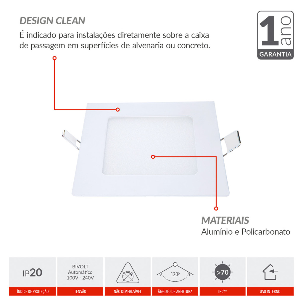 Kit 5 Painel Led Aluminio Quadrado Embutir 6w 12w 18w 24w Branco Quente/Neutro/Frio 110v/220v Bivolt Branco - Avant O Painel de Led Avant é ideal para instalações diretamente sobre a caixa de passagem, em superfícies de alvenaria ou concreto. Proporciona iluminação eficiente e moderna para diversos ambientes. • PROPRIEDADES - Corpo em alumínio e difusor em policarbonato - Potência: 6w, 12w 18w ou 24w - Fluxo luminoso constante em toda faixa de tensão - Possui transformador eletrônico isolado • NAS OPÇÕES DE TEMPERATURA DE COR: - 3000k Branco quente - 4000k Branco Neutro - 6500k Branco Frio • CARACTERÍSTICAS DE FUNCIONAMENTO: - Temperatura ambiente: -5°C a 40°C - Tensão nominal: 100V a 240V (Bivolt automático) - Fator de potência: >0,50 - IRC: >70 - Ângulo de abertura: 120° - Índice de proteção: IP20 (uso interno) - Baixo consumo de energia * Não dimerizável. * Garantia: O Painel de Led Avant possui garantia oficial de 12 meses para defeitos de fabricação. Sobre a Marca Avant A Avant é uma marca reconhecida pela qualidade e inovação em soluções de iluminação. Com foco em design moderno e tecnologia eficiente, a Avant oferece produtos que aliam beleza, funcionalidade e baixo consumo de energia, garantindo uma iluminação agradável e duradoura para seus ambientes.