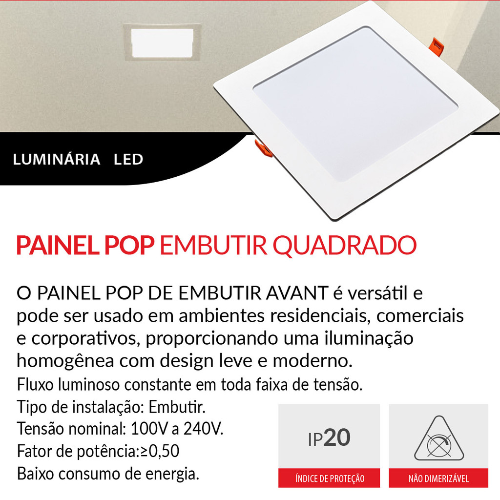 O que Você Esta comprando: 05 Painéis LED Pop Quadrado de Embutir 24W 6500K Identificação do Produto Produto: Painel LED Pop Quadrado de Embutir Modelo: PAINEL POP PS QUADRADO EMBUTIR Referência: 0839 (903021373) Marca: Avant Tipo de Instalação: Embutir Descrição do Produto O Painel LED Pop de Embutir Quadrado 24W foi desenvolvido para oferecer iluminação homogênea, eficiente e moderna. Indicado para ambientes residenciais, comerciais e corporativos, possui design clean que se adapta facilmente a diferentes projetos luminotécnicos. Conta com corpo em PS e difusor em policarbonato, garantindo boa dissipação térmica e distribuição uniforme da luz. Especificações Técnicas Potência: 24W Fluxo Luminoso: 1680 lúmens Eficiência Luminosa: 70 lm/W Temperatura de Cor: 6500K (Branco Frio) Ângulo de Abertura: 120° Tensão Nominal: 100V a 240V Fator de Potência: = 0,90 Temperatura de Operação: -5°C a 40°C Material do Corpo: PS Material do Difusor: Policarbonato Dimensões do Produto (Podem variar até 5% conforme fabricante) Altura: 285 mm Largura: 285 mm Características Principais Iluminação uniforme e homogênea Fluxo luminoso constante em toda faixa de tensão Baixo consumo de energia Design moderno e discreto Indicado para uso residencial, comercial e corporativo Recomendações de Instalação O transformador eletrônico não deve ficar em contato com a luminária, pois a base atua como dissipador de calor. Espessura mínima do forro recomendada: 1 cm. Distância mínima entre forro e laje: 10 cm, para garantir maior vida útil do produto. Sku: Av0097O que Você Esta comprando: 02 Painéis LED Pop Quadrado de Embutir 24W 6500K Identificação do Produto: Produto: Painel LED Pop Quadrado de Embutir Modelo: PAINEL POP PS QUADRADO EMBUTIR Referência: 0839 (903021373) Marca: Avant Tipo de Instalação: Embutir Descrição do Produto: O Painel LED Pop de Embutir Quadrado 24W foi desenvolvido para oferecer iluminação homogênea, eficiente e moderna. Indicado para ambientes residenciais, comerciais e corporativos, possui design clean que se adapta facilmente a diferentes projetos luminotécnicos. Conta com corpo em PS e difusor em policarbonato, garantindo boa dissipação térmica e distribuição uniforme da luz. Especificações Técnicas: Potência: 24W Fluxo Luminoso: 1680 lúmens Eficiência Luminosa: 70 lm/W Temperatura de Cor: 6500K (Branco Frio) Ângulo de Abertura: 120° Tensão Nominal: 100V a 240V Fator de Potência: = 0,90 Temperatura de Operação: -5°C a 40°C Material do Corpo: PS Material do Difusor: Policarbonato Dimensões do Produto: (Podem variar até 5% conforme fabricante) Altura: 285 mm Largura: 285 mm Características Principais: Iluminação uniforme e homogênea Fluxo luminoso constante em toda faixa de tensão Baixo consumo de energia Design moderno e discreto Indicado para uso residencial, comercial e corporativo Recomendações de Instalação: O transformador eletrônico não deve ficar em contato com a luminária, pois a base atua como dissipador de calor. Espessura mínima do forro recomendada: 1 cm. Distância mínima entre forro e laje: 10 cm, para garantir maior vida útil do produto. Sku: av0100 Garantia Garantia de fábrica: 1 ano.