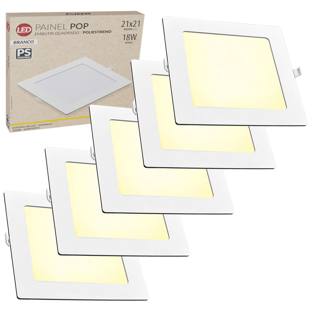 Kit 5 Unidades do Painel Pop de Embutir Quadrado Avant O PAINEL POP DE EMBUTIR AVANT é versátil e pode ser usado em ambientes residenciais, comerciais e corporativos, proporcionando uma iluminação homogênea com design leve e moderno. Fluxo luminoso constante em toda faixa de tensão. Baixo consumo de energia. Informações Técnicas: Código: 903010575 Marca: Avant Potência: 18W Tensão: 127v/220v Bivolt Automático Emissão de Luz: Amarela Temperatura da Cor: 3000K Fluxo Luminoso: 1080 Lumens Eficiência Luminosa: 70 Lm/Watts Temperatura ambiente: -5°C a 40°C. Fator de potência: =0,50 Dimerizavel: Não Índice de Proteção: IP20 Tipo de instalação: Embutir Material: Poliestireno Vida útil Aproximada: 25 Mil Horas Garantia: 12 Meses Dimensões Aproximada: 210x210x16mm ATENÇÃO: Na instalação do transformador eletrônico, certifique-se de que o mesmo não ficará em contato com a luminária, pois toda a base da luminária funciona como dissipador de calor, o que pode causar danos e interferências no funcionamento do transformador.