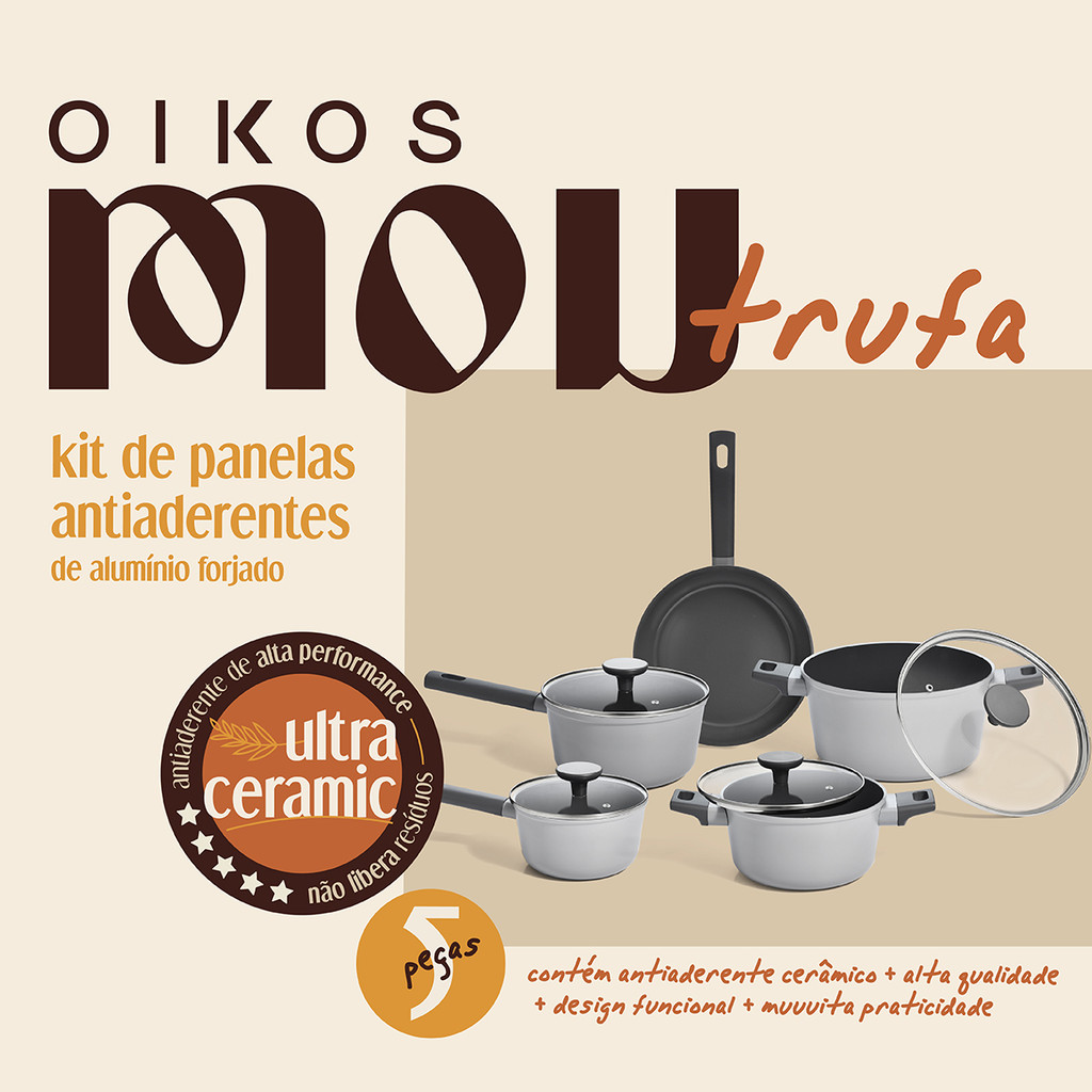 "Conheça o Jogo de 5 Panelas Antiaderentes Ultra Ceramic Indução Mou Trufa da Oikos! resistentes e modernas, são perfeitas para fazer suas receitas favoritas! elas têm antiaderente cerâmico de alto desempenho: evitam que os alimentos grudem e são livre de toxinas! as panelas são forjadas: o processo confere maior durabilidade, distribuição de calor mais uniforme e melhora na retenção de calor, permitindo que a panela aqueça rapidamente e mantenha a temperatura. as panelas têm 4mm de espessura nas bordas e 2,8mm no corpo e a frigideira tem 3,7mm de espessura na borda e 2,3mm no corpo: distribuem melhor o calor e evitam que os alimentos queimem. possuem 5 camadas: antiaderente cerâmico, camada antidesgaste interna, alumínio, camada antidesgaste externa e pintura externa. também têm uma camada extra de aço inox na base de indução! os cabos e as alças são em baquelite: resistentes a altas temperaturas - não esquentam! a tampa é reta com borda de inox: vedação aprimorada e menos desgastes nas bordas das panelas. a tampa de vidro temperado tem saída de vapor que promove mais segurança e praticidade ao visualizar os alimentos. podem ser usadas em todos os tipos de fogão: indução, gás, elétrico e vitrocerâmico. não podem ir ao forno ou em microondas! processo de cura indicado: basta aplicar uma pequena quantidade de óleo vegetal com o auxílio do papel toalha, aquecer em fogo baixo por 1 a 2 minutos e, após esfriar, é só lavar e secar! as panelas são de alumínio, baquelite, vidro e têm revestimento cerâmico. cuidados: não use objetos pontiagudos ou de metal durante o cozimento; o utensílio mais indicado é o de silicone! leve qualidade e modernidade para sua casa! o jogo contém: • 2 caçarolas: 1: diâmetro: 25cm distância entre as alças: 38cm altura:13cm litragem: 4,37L 2: diâmetro: 21cm distância entre as alças: 33cm altura:11cm litragem: 2,66L • 2 panelas: 1: diâmetro: 21cm diâmetro + cabo: 38cm altura:11cm litragem: 2,66L 2: diâmetro: 18cm diâmetro + cabo: 34cm altura: 10cm litragem: 1,36L • 1 frigideira: diâmetro: 25cm diâmetro + cabo: 43cm altura: 6cm litragem: 1,65L"