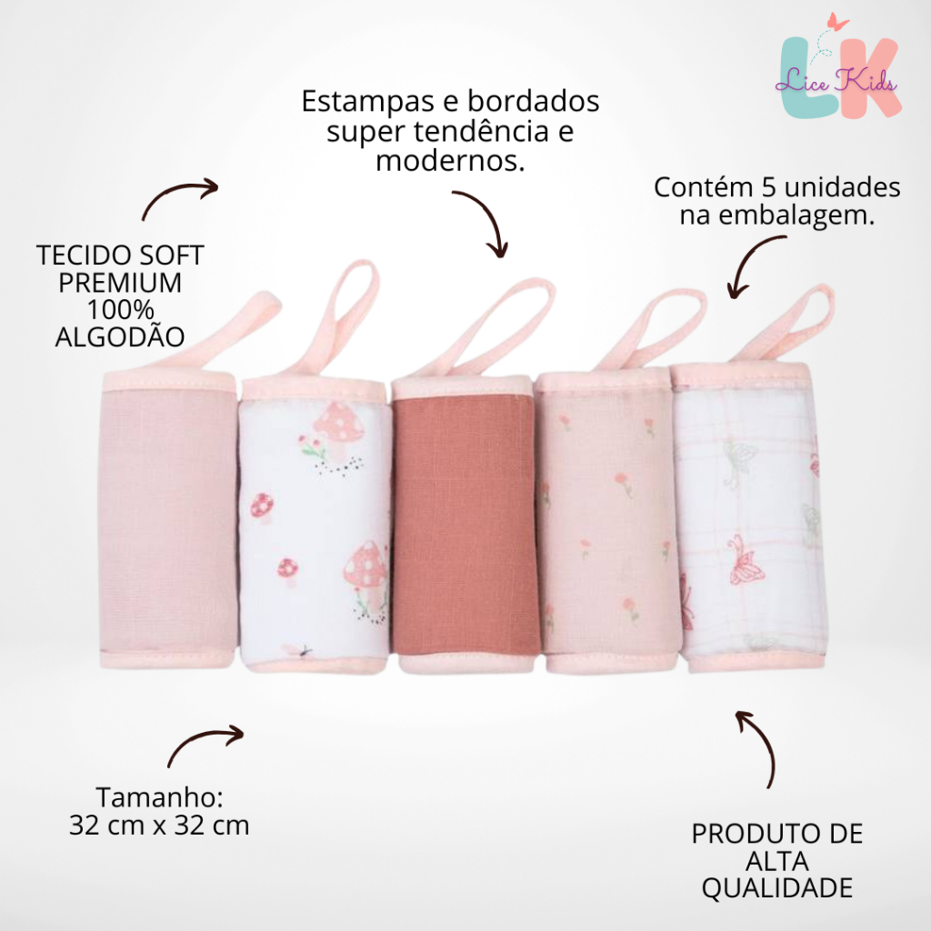 Kit 5 Panos de Boca com Prendedor de Chupeta 32x32 cm Papi Soft Tinto 100% Algodão