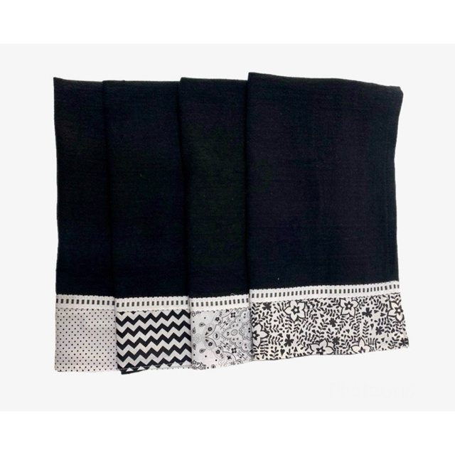 Modernidade na sua cozinha com o pano de prato preto minimalista. Material pé de galinha, absorve muito bem proporcionando uma secagem mais eficaz, tamanho ótimo de 41x66 Cm, barrados variados todos em padrão minimalistas, bainha lateral, costura dupla no barrado proporcionando mais durabilidade. Tam: 41x66 cm Quantidade: 05 Unidade Estampas variadas sem repetição 100% Algodão pé de galinha Recomendação: Guarde e lave seus panos pretos separadamente dos panos branco