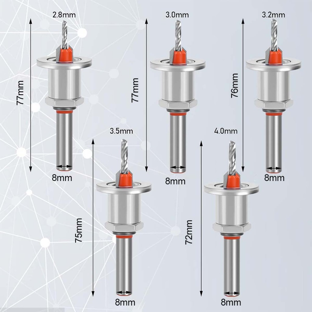 O pacote inclui 5x brocas de contrafuro descritivo AÇO TRATADO COM CALOR DE ALTA VELOCIDADE: as brocas escareadoras são feitas de aço de alta velocidade, endurecido e tratado, por isso são duras, resistentes ao desgaste e robustas. VÁRIOS TAMANHOS: O conjunto de brocas escareadoras inclui 5 tamanhos: 2,8 x 8 mm, 3,0 x 8 mm, 3,2 x 8 mm, 3,5 x 8 mm, 4,0 x 8 mm, perfeito para fazer furos em madeira de vários tamanhos. Multiuso, melhora a eficiência do trabalho. Design de ponta tripla: faz furos suaves com rapidez e precisão. Design de chanfro pentagonal: descarrega automática e rapidamente os detritos de ambos os lados do furo, evitando o acúmulo e a estagnação de detritos e melhorando a eficiência da perfuração. Adequado para máquinas de perfuração com mandris ou acessórios, é o conjunto ideal de brocas escareadoras ajustáveis para madeira.
