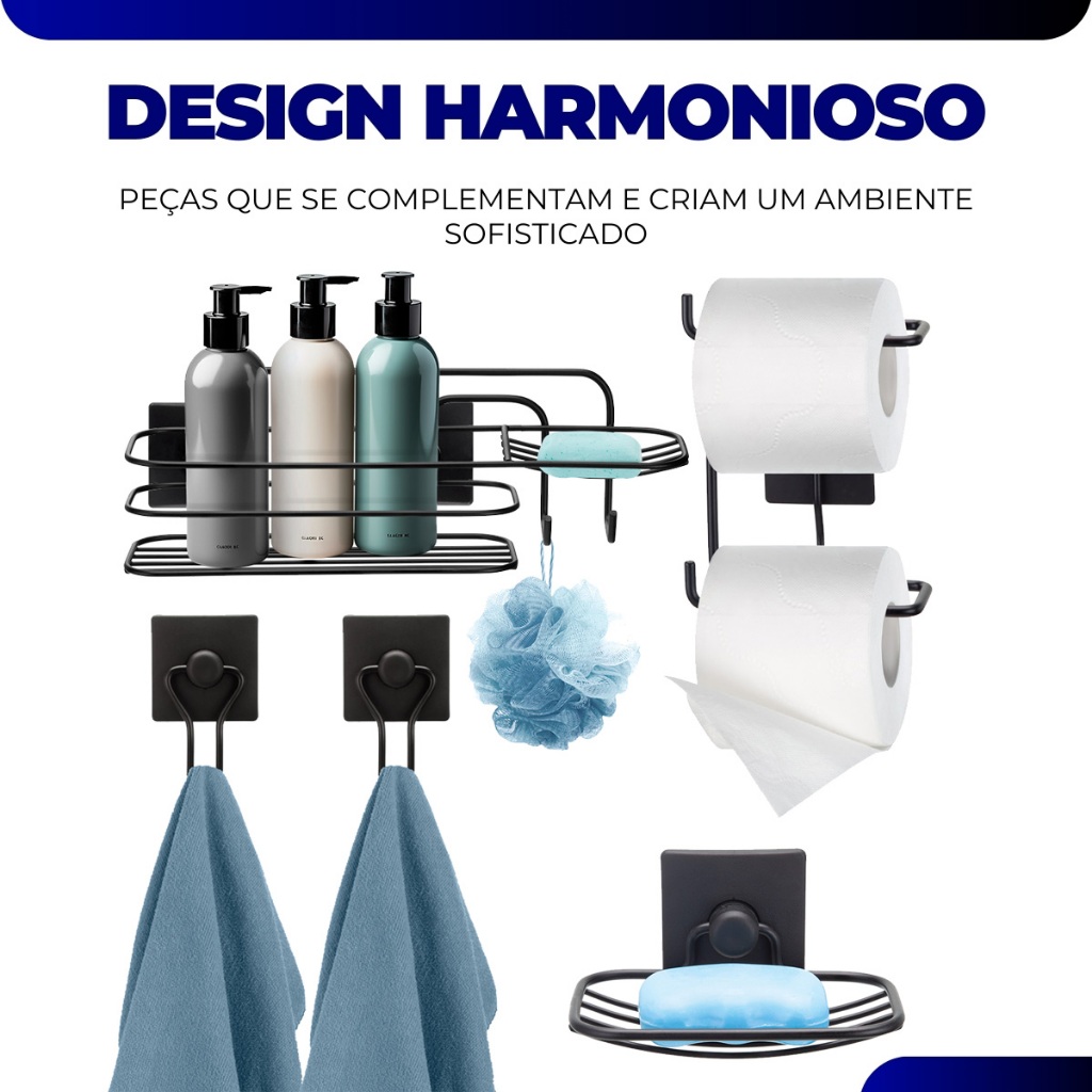 Kit 5 Pecas Acessorios Banheiro Porta Shampoo Papel Gancho Saboneteira S/ Furo 3m Preto Arthi