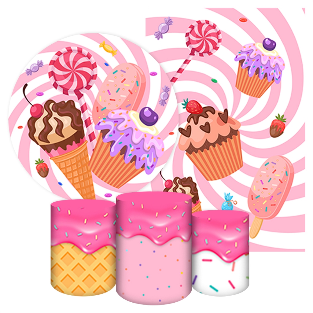 Kit 5 Peças Capa Painel Redondo + Capa Retangular + Trio Cilindros para Festa Tema Doces