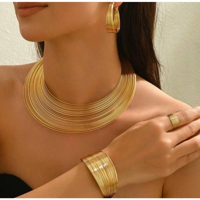 Kit 5 Peças de Colar Choker Feminina, Brincos, Anel e Pulseira Design Moderno Fios Metálicos Elegantes