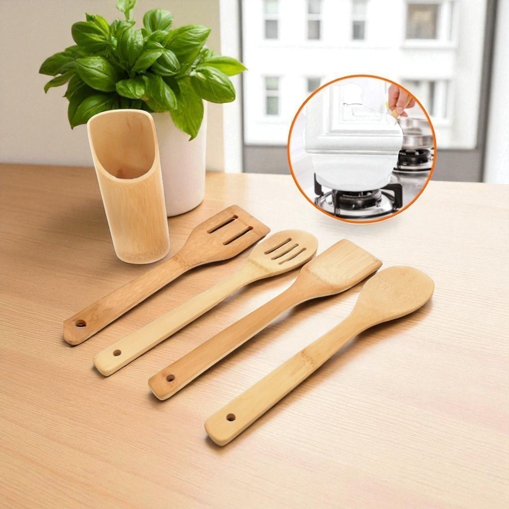 Kit 5 Peças Utensílios Em Bambu Conjunto Colher De Pau para Cozinha (4 Talheres com Suporte)