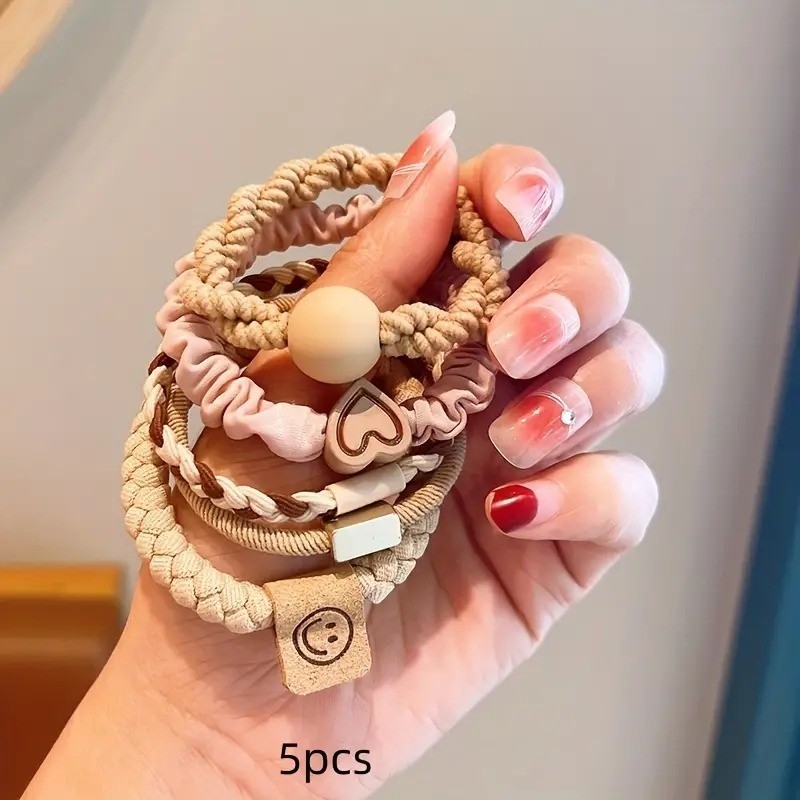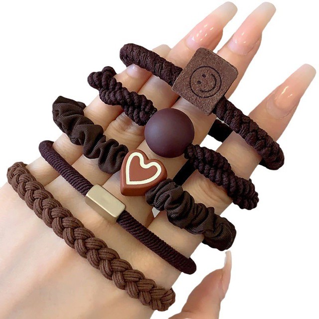 O pacote contém: Kit 5 Peças de elástico para cabelo (ou usa como pulseira) Características: Estampa: Lisa Estilo: Casual Cores Disponíveis: Preto / Marrom Café / Marrom Caramelo / Caqui Claro / Off-white
