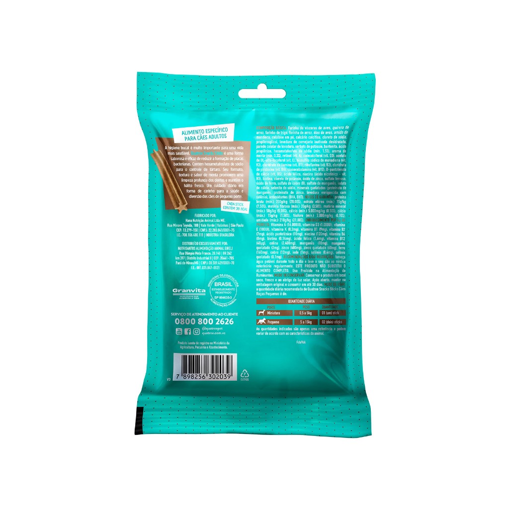 O kit consiste em 5 (unidades) unidades de petisco Quatree Snacks Cães Sticks Raças Pequenas Controle de Tártaro e Mau Hálito 60Gr - Controle de Tártaro - Sabor Menta - Hálito Fresco - Sem Corantes Artificiais