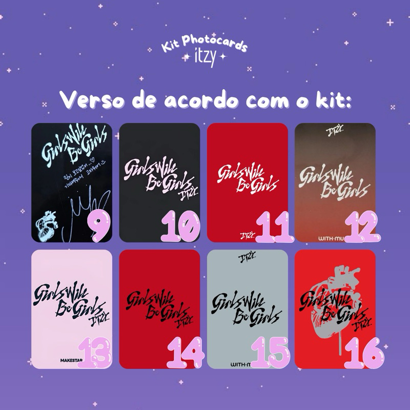 Kit de cinco photocards do grupo ITZY para Girls Will Be Girls! 💜 ————————————————————————————— Detalhes do produto: Tamanho: aproximadamente 8,5 X 5,3cm Impressão: Papel fotográfico glossy 230g Frente e verso: Ao pedir a opção “frente e verso”, o verso é predeterminado pelo kit escolhido. Caso queira alguma alteração, comunique através do chat Bordas arredondadas (caso prefira bordas retas, avise no chat após realizar a compra) Obs: Produto plastificado, resistente à água e difícil de amassar! ————————————————————————————— Atenção: item feito por fã manualmente, pode haver uma mínima diferença de tamanho entre os photocards. Estou à disposição para esclarecimentos de dúvidas no chat! 💜