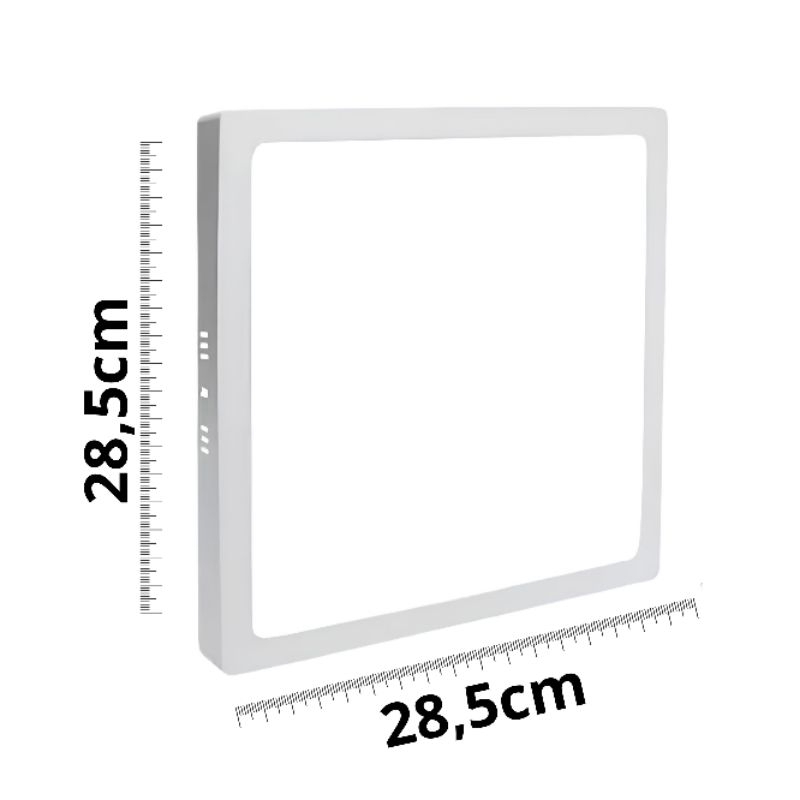 PLAFON LED SOBREPOR | QUADRADO 24W ESPECIFICAÇÕES TÉCNICAS Potência: 24W Cores Disponíveis: Branco Modelo: Quadrado Sobrepor Material : CORPO - ABS | PLACA FRONTAL - PS | DISSIPADOR DE CALOR - ALUMÍNIO Disponível em: 3000K Branco Quente Luminosidade: 80lm/w Vida Útil: 25.000 horas Voltagem: 127-220V (Bivolt) Frequência: 50/60 hz Ângulo de abertura: 180° Temperatura de operação: -10ºC a 40ºC Economia de energia em até 90% Prot: IP20 IRC ≥80 Dimensões: 285mm x 285mm x 27mm