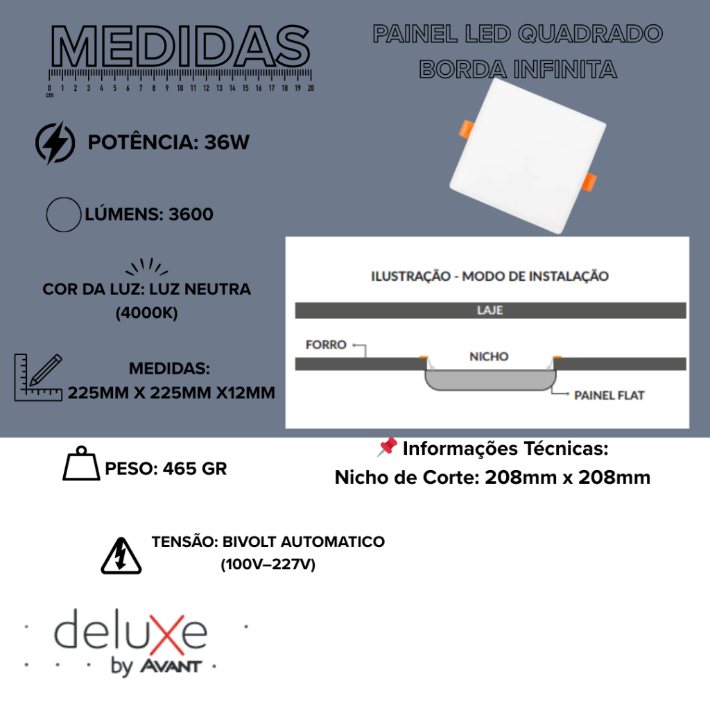 Kit C/ 5 paineis 💡 Eficiência, economia e visual moderno para iluminar com estilo! Ideal para quem deseja um ambiente claro, aconchegante e bem iluminado, o Painel LED Flat Quadrado de 36W da Avant é perfeito para instalação embutida em forros de gesso, PVC ou modulado. Com design de borda infinita e espessura ultra fina, entrega um acabamento discreto e sofisticado, valorizando qualquer espaço com elegância. ✅ Especificações Técnicas 🔹 Potência: 36W – Equivalente luminosa a uma lâmpada de 15 0W 🔹 Temperatura de Cor: 4000K (Luz Neutra – entre o branco frio e o amarelado) 🔹 Fluxo Luminoso: ~3600 lúmens – Forte, uniforme e confortável para os olhos 🔹 Voltagem: Bivolt (100–240V) 🔹 Índice de Reprodução de Cor (IRC): ≥80 🔹 Fator de Potência: ≥0,50 🔹 Vida Útil: Até 25.000 horas 🔹 Instalação: Embutir (encaixe perfeito com acabamento rente ao teto) 🔹 Driver incluso – alimentação estável e segura 🔹 Acionamento: Interruptor comum de parede 📐 Medidas 📏 Dimensões Externas: 225mm × 225mm × 12mm ✂️ Nicho de Corte Recomendado: 208mm × 208mm (Corte necessário no forro para instalação correta) 🌟 Benefícios do Produto 💡 Iluminação homogênea, sem sombras ou ofuscamento 🎨 Luz neutra que valoriza as cores reais do ambiente 💰 Economia de energia com desempenho superior 🛠️ Fácil instalação, com driver incluso e pronto para uso ✅ Compatível com diversos tipos de forro 🌿 Produto ecológico: livre de chumbo e mercúrio, não emite raios UV ou IR 🎯 Ideal Para: Salas, quartos, cozinhas, corredores, lavabos, escritórios, lojas, closets e muito mais! Ambientes que pedem conforto visual, eficiência energética e design discreto. 📦 Disponível também em Kit 3 | Kit 5 | Kit 10 com preços especiais. Aproveite!