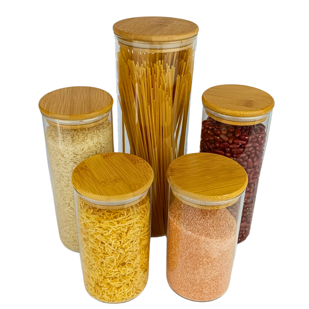 Kit 5 Porta Mantimentos Pote Hermético Vidro Tampa de Bambu Alimentos Organizador Cozinha Despensa
