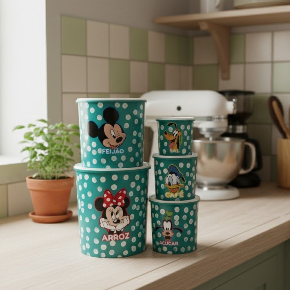 Kit 5 Pote Plástico Mantimento Hermético Organizadores de Cozinha Alimentos Redondo Mickey Minnie