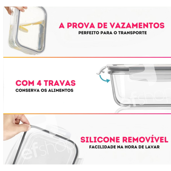 5 Potes Herméticos de Vidro Retangulares – 1040 ml 700 g Organize suas refeições com muito mais praticidade e s egurança. Este pote hermético de vidro de 1,40 litro, ideal para montar marmitas completas. A tampa conta com 4 travas firmes, anel de vedação em silicone e válvula de vapor, oferecendo vedação eficiente e uso seguro no micro-ondas. Produzido em vidro resistente a altas temperaturas, suporta até 220°C (evite choque térmico)* e pode ser utilizado no forno sem tampa, micro-ondas com válvula aberta, freezer e geladeira. Se você busca um pote durável, seguro, fácil de limpar e perfeito para substituir potes de plástico, este é o modelo ideal. Diferenciais: •Tampa hermética com 4 travas e anel de silicone. •Válvula de saída de vapor para micro-ondas. •Vidro resistente a até 220°C. •Não retém odores e não mancha. •Livre de BPA. •Vedação eficiente, sem vazamentos. •Fácil higienização (anel removível). Ideal para: •Marmitas completas para trabalho, escola ou academia. •Armazenar alimentos na geladeira e freezer. •Aquecer refeições no micro-ondas com segurança. •Presentear familiares e amigos. Ficha Técnica: •Modelo: Pote de Vidro Retangular •Capacidade: 1040ml •Dimensões: 19 x 14 x 6 cm (C x L x A) •Peso: 700 g •Cor do silicone: Aleatórias * Evite choque térmico: não coloque o alimento congelado diretamente em altas temperaturas. O ideal é que esteja previamente descongelado ou resfriado.