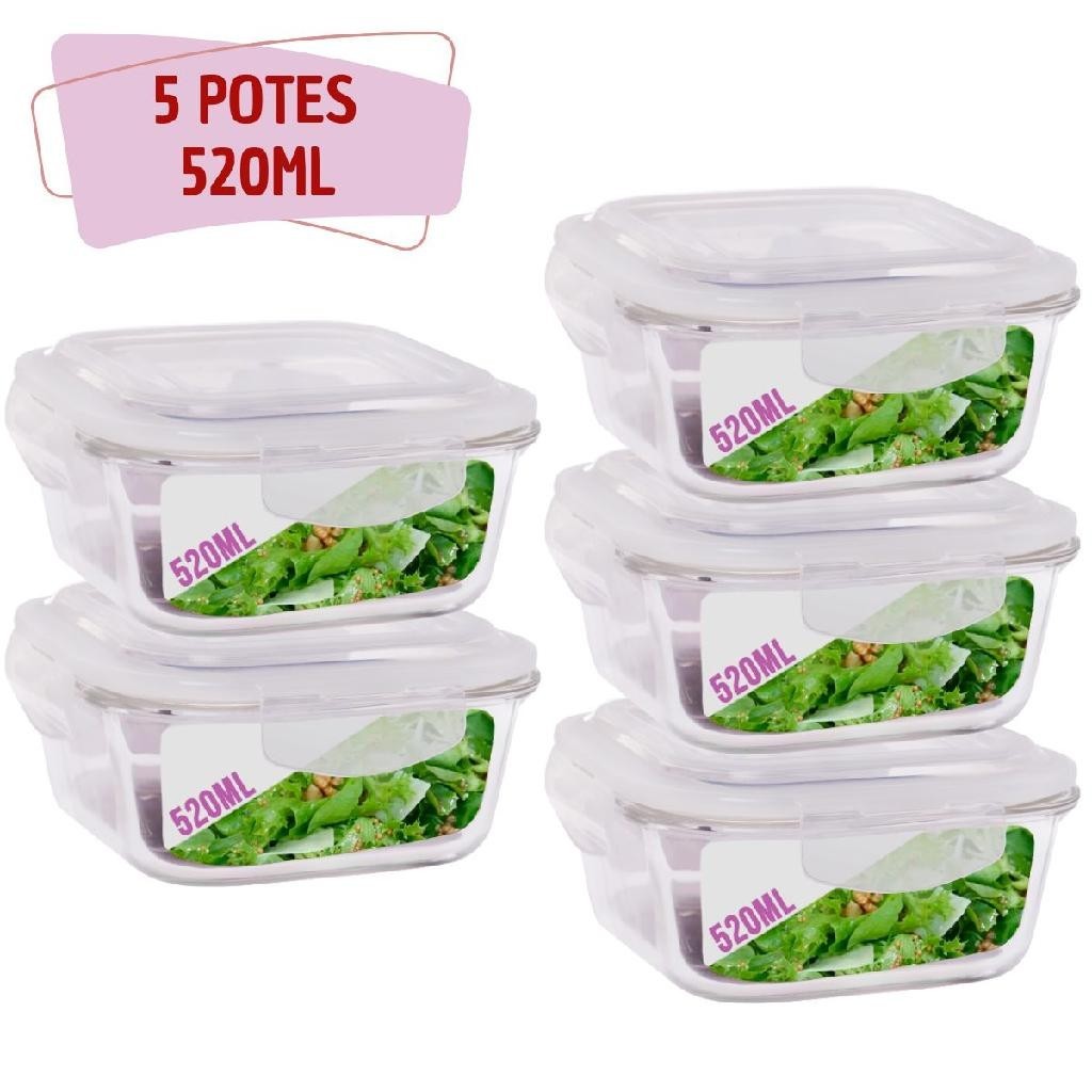 Kit 5 Potes 520ml de Vidro Marmita Tampa Silicone Não Vaza