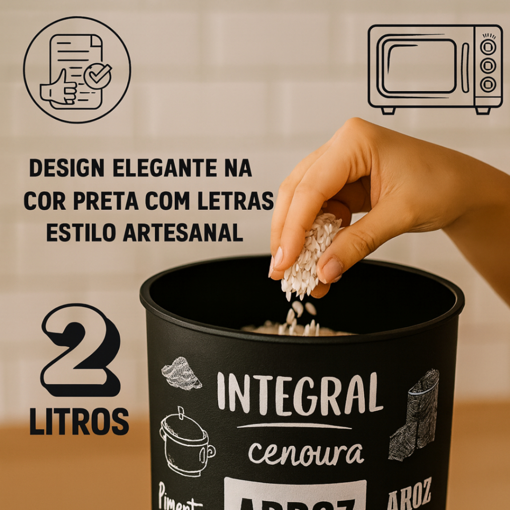 Transforme sua cozinha em um ambiente mais organizado, prático e elegante com este kit exclusivo de potes decorados! Cada pote possui capacidade de 2 litros, ideal para armazenar mantimentos do dia a dia mantendo tudo fresquinho, protegido e ao seu alcance. Itens inclusos (com estampas individuais): 1 pote para Feijão 1 pote para Arroz 1 pote para Açúcar 1 pote para Café 1 pote para Farinha Características do produto: Design elegante na cor preta com letras brancas, estilo artesanal Tampa de encaixe seguro, protegendo contra umidade e insetos Capacidade: 2L cada Fácil de limpar e reutilizar Ideal para organização de despensas, cozinhas e prateleiras Mantém seus mantimentos identificados e bem armazenados Perfeito para quem busca: Organização Economia de espaço Cozinha harmônica e estilosa Produtos duráveis e fáceis de usar Garanta já o seu kit e deixe sua cozinha mais bonita e funcional!