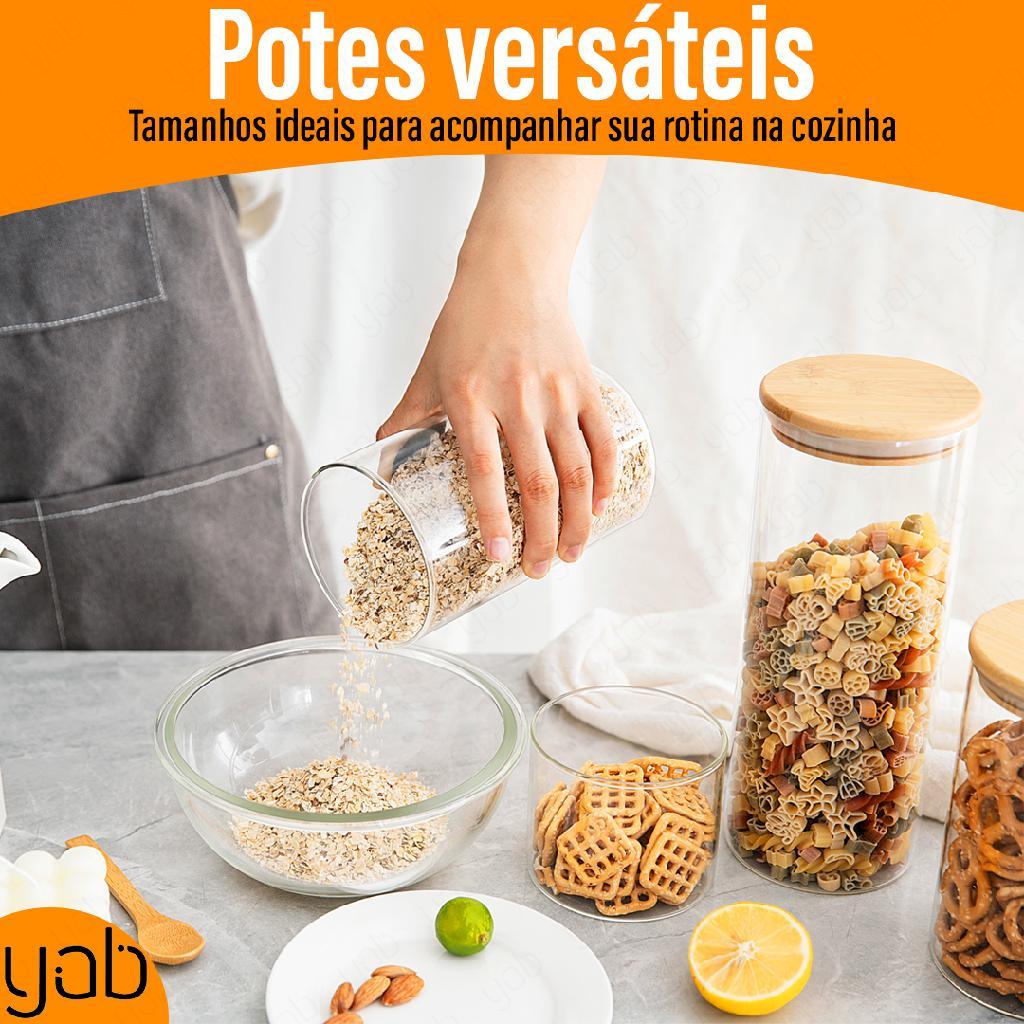 Kit 5 Potes Herméticos Vidro Borossilicato Tampa Bambu Yab Organizadores Cozinha Vedação