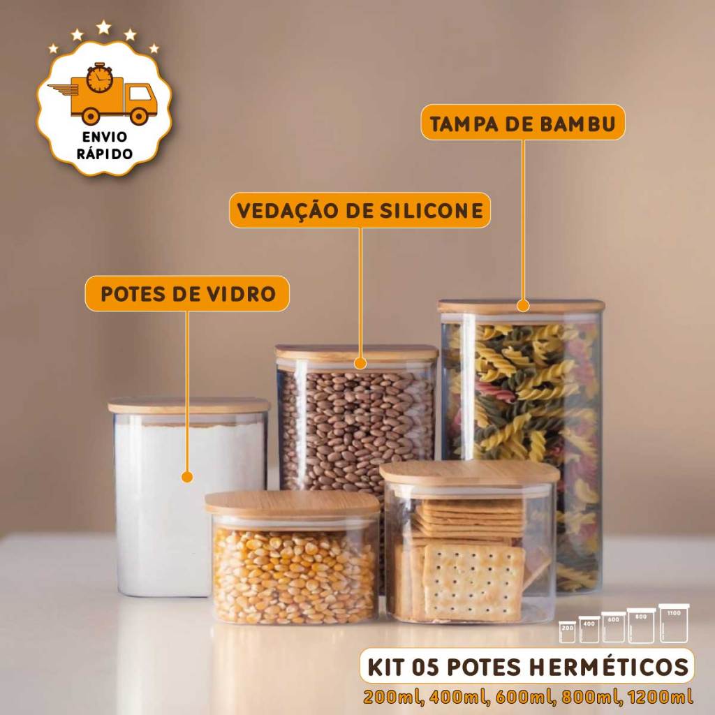 Encontre o item Kit 5 Potes Herméticos Vidro Tampa Bambu Condimentos Organizador Temperos Alimentos Porta Mantimento na subcategoria Armazenamento de Alimentos (de Casa e Decoração), disponível na Shopee Brasil por R$ 124,74 (36% de desconto sobre o preço original de R$ 194,91). Nota 4.9 de 5 na Shopee e 42 unidades vendidas, este produto se destaca pelo excelente custo-benefício.