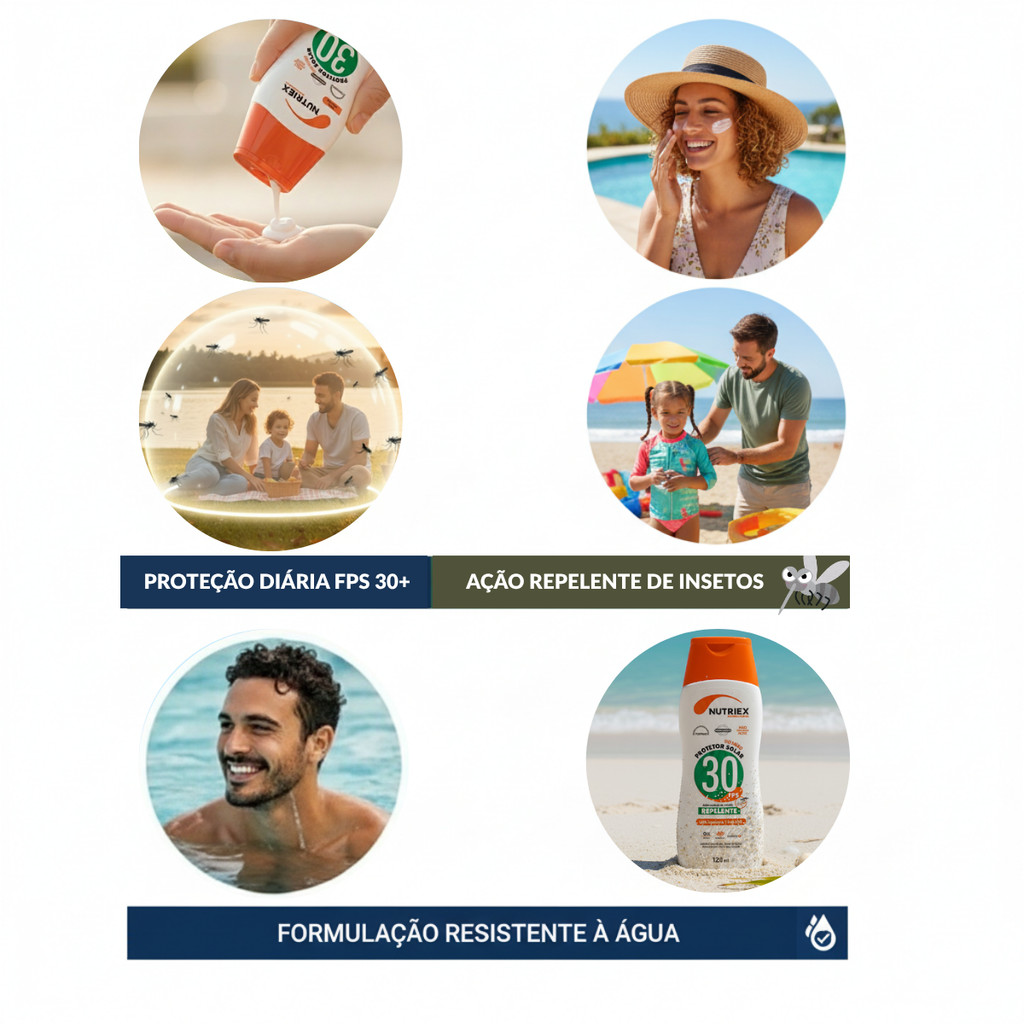 KIT 5 Protetor Solar Nutriex FPS 60 Com Repelente 120ML O Protetor Solar Nutriex FPS 60 com Repelente é a escolha ideal para quem busca proteção solar e proteção contra insetos em um só produto. Sua fórmula exclusiva com Bioactive E® e Vitamina E garante ação antioxidante e previne o envelhecimento precoce da pele, enquanto protege contra os raios UVA e UVB. Com FPS 60, proporciona proteção eficaz para uso diário e em atividades ao ar livre, sendo resistente à água e ao suor. Sua ação repelente ajuda a afastar mosquitos e insetos, trazendo mais segurança em ambientes externos, como praias, piscinas, pescarias, trilhas e trabalhos a céu aberto. Dermatologicamente testado, o protetor é hipoalergênico, oil free, toque seco, de rápida absorção e não provoca acne, garantindo conforto e eficácia em todas as ocasiões. Benefícios: * FPS 60 proteção solar intensiva contra queimaduras e danos causados pelo sol * Repelente de insetos, ação protetora contra mosquitos e outros insetos * Bioactive E® + Vitamina E ação antioxidante, previne envelhecimento precoce * Hipoalergênico e dermatologicamente testado * Oil Free não oleoso, não obstrui os poros * Não provoca acne * Toque Seco * Rápida absorção e aplicação fácil * Fragrância suave * Não deixa a pele esbranquiçada * Muito resistente à água e ao suor * Proteção reforçada: UVA superior a 1/3 de UVB * Indicado para uso diário e exposição prolongada ao sol Modo de Aplicar: Aplique abundantemente sobre a pele antes da exposição solar. Reaplique sempre que necessário, especialmente após suar em excesso, nadar, se secar com toalha ou em períodos prolongados sob o sol. Para crianças menores de 6 meses, consulte um médico antes da utilização. Nuvem de Tags: Protetor Solar, Nutriex, Fps 60, Protetor Solar Repelente, Bioactive E, Vitamina E, Toque Seco, Uso Diário, Oil Free, Hipoalergênico, Não Oleoso, Não Provoca Acne, Resistente Água, Resistente Suor, Proteção Uva, Proteção Uvb, Alta Proteção Solar, Proteção Intensa, Proteção Solar Com Repelente, Repelente De Insetos, Repelente De Mosquitos, Protetor Solar Adulto, Protetor Solar Infantil.