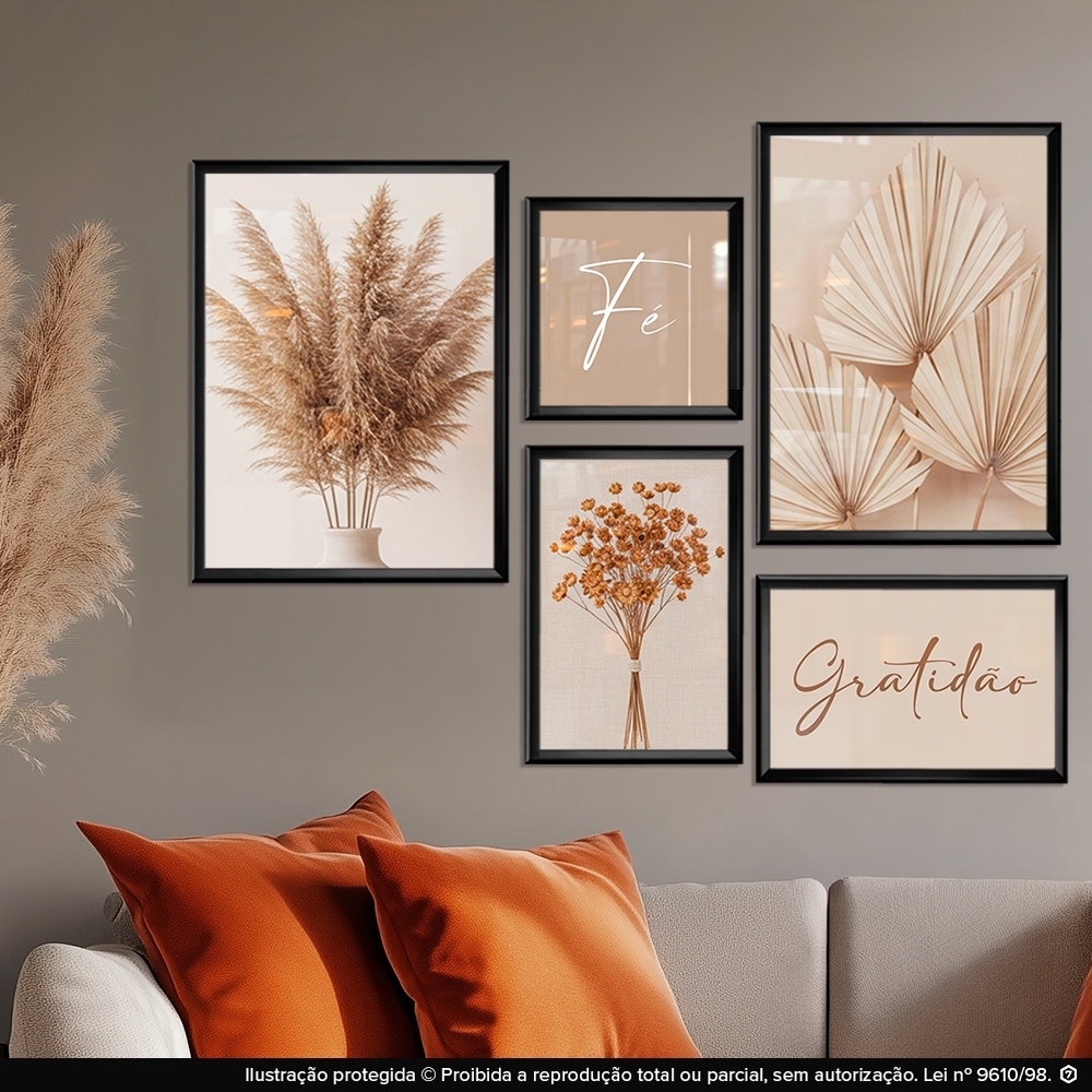 Kit 5 Quadrinhos Decorativos Gratidão Boho Trigo Prosperidade Flores Fé Sala Hall