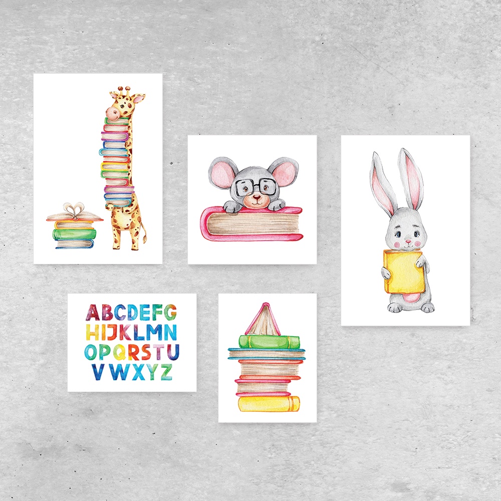 Kit 5 Quadros Decorativos Placas - Animais Livros Educação Escola Infantil Bebê Quarto Menino Menina - 323ktpl5