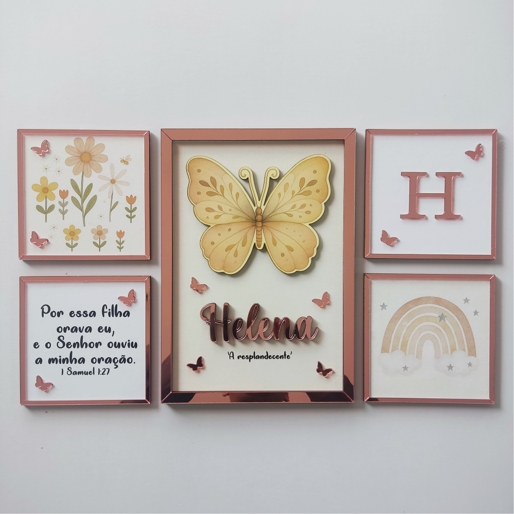 Kit 5 Quadros Decorativos Tema Borboleta com Nome e Versículo - Decoração Quarto Bebê Menina