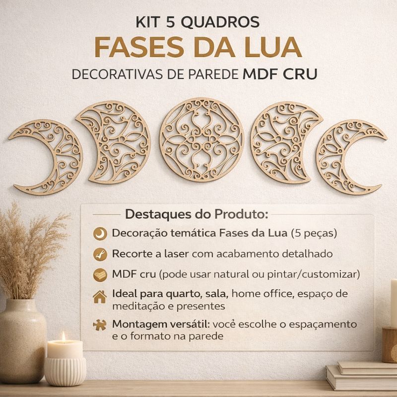 Kit 5 Quadros Fases da Lua MDF Cru Deixe sua decoração mais charmosa e aconchegante com o Kit Fases da Lua em MDF Cru 🌙✨ São 5 peças com recorte a laser e detalhes delicados, perfeitas para criar um painel lindo na parede do quarto, sala, corredor, estúdio ou espaço zen. A instalação é simples: basta posicionar do jeito que você preferir e fixar (ideal para composições modernas e minimalistas). ✅ Destaques do Produto 🌙 Decoração temática Fases da Lua (5 peças) ✂️ Recorte a laser com acabamento detalhado 🪵 MDF cru (pode usar natural ou pintar/customizar) 🏡 Ideal para quarto, sala, home office, espaço de meditação e presentes 🧩 Montagem versátil: você escolhe o espaçamento e o formato na parede 📏 Medidas (cada peça) 📌 2 luas das extremidades: 20 cm (compr.) x 20 cm (alt.) 📌 2 luas do meio: 20 cm (compr.) x 21 cm (alt.) 📌 Lua central: 20 cm (compr.) x 20 cm (alt.) 🪵 Especificações Técnicas 🪵 Material: MDF Cru 🎨 Cor: Cru / Bege natural ✨ Acabamento: Recorte a laser 📦 Conteúdo da embalagem: 5 peças (fases da lua) 📦 Conteúdo da Embalagem ✅ 1 Kit com 5 peças Fases da Lua em MDF cru ⚠️ Observações Importantes • Produto enviado sem pintura, na cor natural do MDF • Pode ser pintado, envernizado ou personalizado • Para melhor fixação, aplique em superfície lisa, limpa e seca