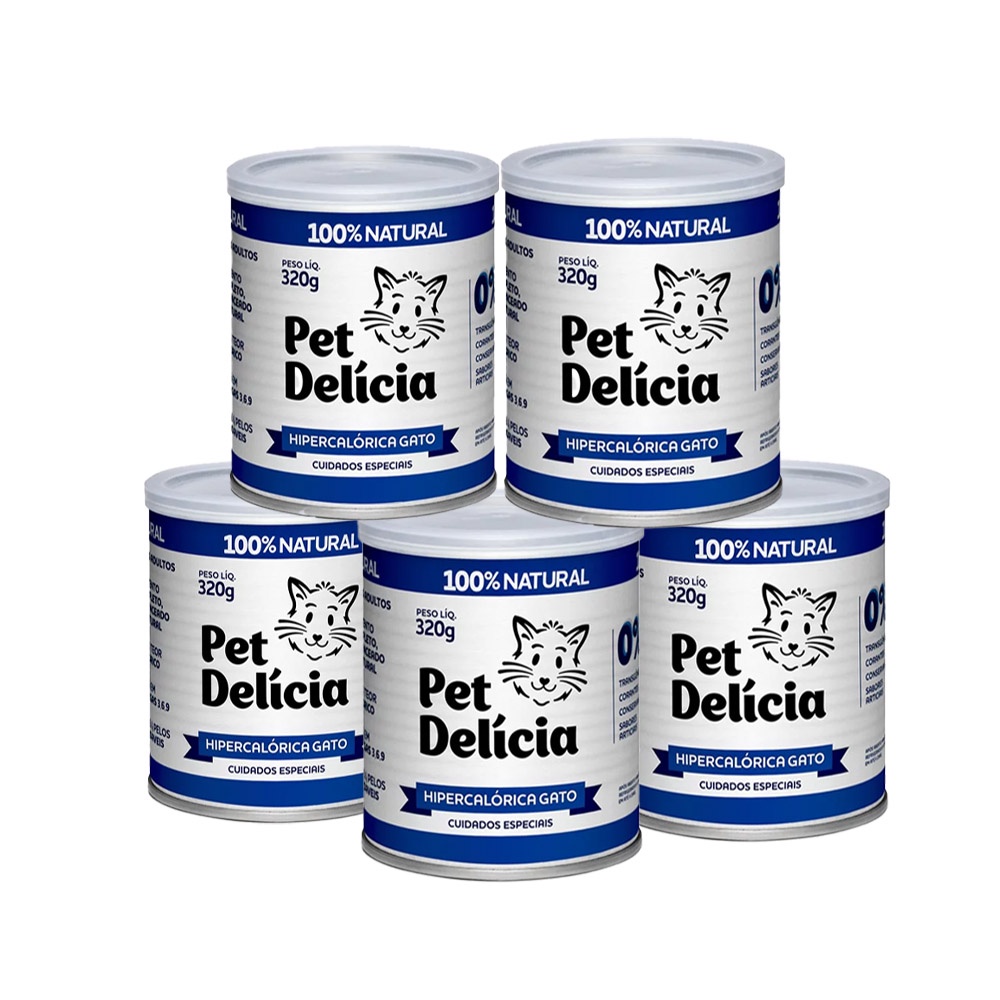 KIT 5 Ração Úmida Pet Delícia Gatos Hipercalórica - 320g - Indicado para gatos; - Para gatos adultos; - Para restabelecer o peso corporal; - Alto teor calórico para promover a recuperação; - Rica em fibras; - Com antioxidantes e anti-inflamatórios naturais. Pet Delícia Hipercalórica Gato é uma receita desenvolvida para gatos que necessitam de cuidados especiais nas fases de recuperação cirúrgica, debilitados ou inapetentes que precisam restabelecer seu peso corporal. A fórmula foi elaborada com cortes nobres de carne bovina, legumes e ingredientes que promovem um alimento com alto teor calórico e ótima aceitação pelos gatos sensibilizados. A Pet Delícia Hipercalórica Gatos é a única receita hipercalórica para gatos do mercado e foi desenvolvida por especialistas em nutrição animal especialmente para gatos convalescentes e debilitados, que estejam em processo pós-cirúrgico ou hospitalizados e gatos abaixo do peso. Recomendação Diária Indicação de consumo sugerida considerando a necessidade calórica diária, sujeito adaptações por atividade física ou metabolismo individual. Para saber exatamente a quantidade de acordo com o peso do seu gato CLIQUE AQUI. Peso (kg) Quantidade diária (g) 1,0-2,0 53-106 2,0-3,0 106-158 3,0-4,0 158-211 4,0-5,0 211-263 Acima de 5 quilos acrescente mais 1 lata de 110g para cada 2 quilos de peso do gato. Introduzir de forma gradativa ao longo de 1 semana. Sugere-se adequar a quantidade proporcionalmente como complemento (cada 100g deste alimento equivale aprox. 30g de ração seca). Ingredientes Fontes de proteína: carne bovina, coração bovino, língua bovina, ovos Legumes: abobrinha, cenoura, ervilhas, batata doce, beterraba, chuchu Óleos: azeite de oliva, óleo de girassol, lecitina de soja não transgênica Funcionais: aveia, algas, levedura seca Enriquecimento: taurina, vitaminas e minerais